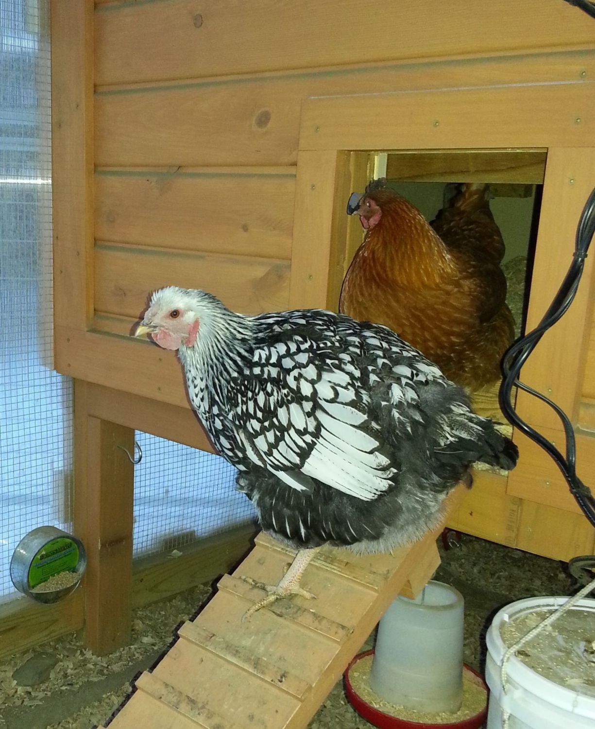 The silver laced wyandotte "mother" is the molter, lost her big tail feathers, some feathers on her back and all over, all the feathers on her head and neck. in this photo she still has some. There you can see my EE "Silly Goose" with an apron (this was about 4 weeks ago?) Also cluck-cluck with the peepers, she is the major feather picker.