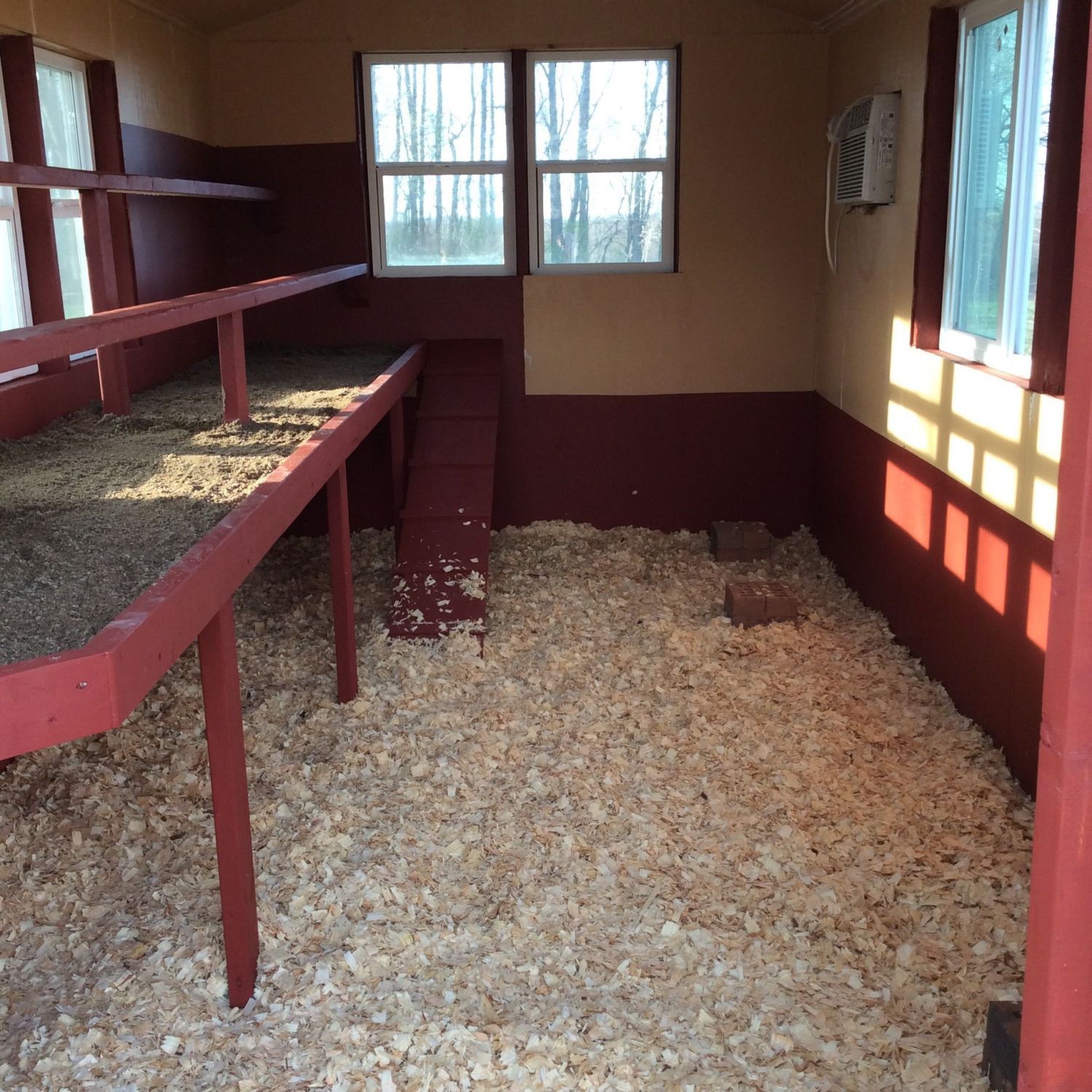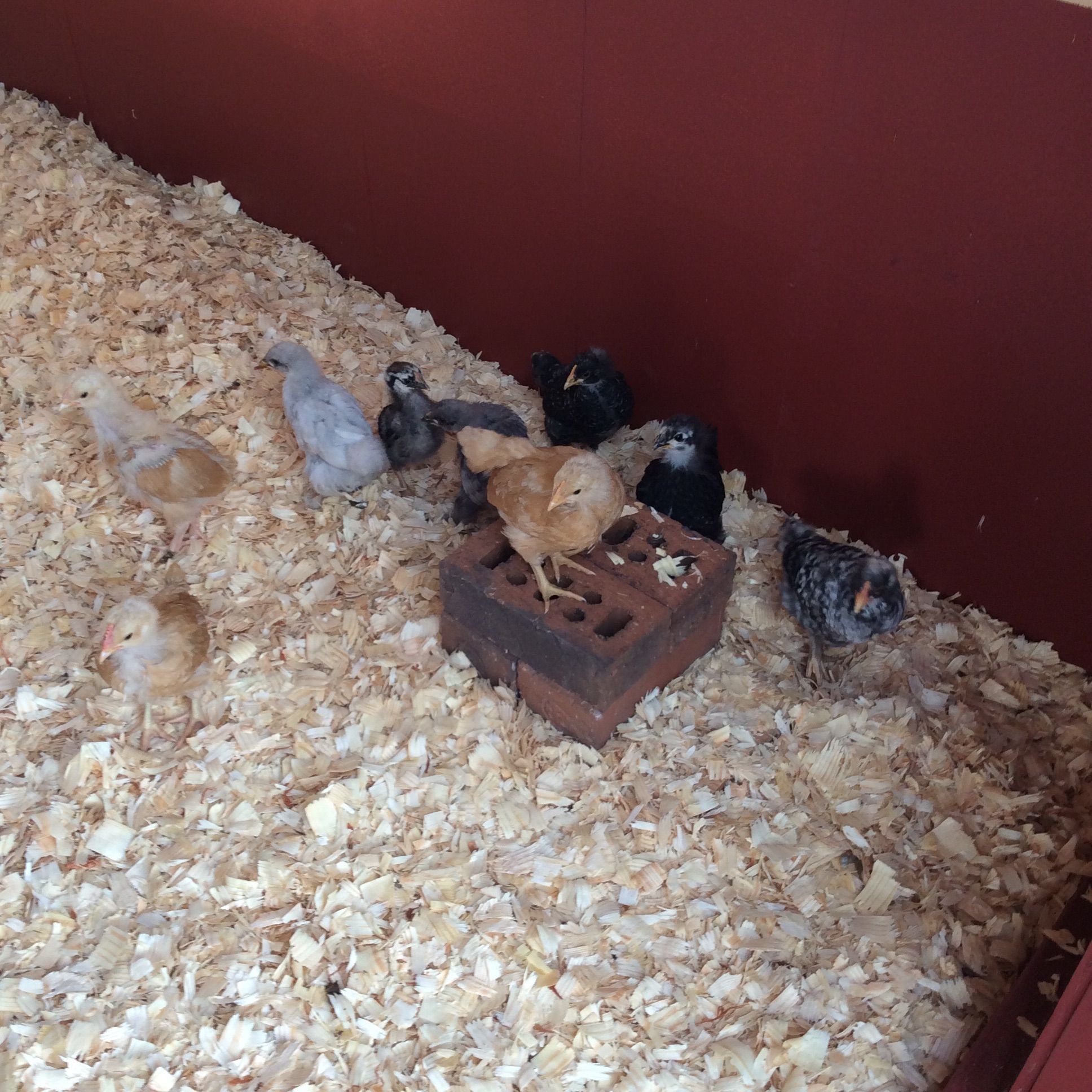 We moved the chicks out to the coop today! I am so relieved. Here are a few of them enjoying their new home. We still have a bunch of work to do, but for now they are safe and warm. The walls are red and yellow. The yellow was there from the previous owner's (also the AC unit), and my DH insisted upon red for his little poultry barn. Ironically he seems to be allergic to their dander(?)/dust so chicken duties will be mine.