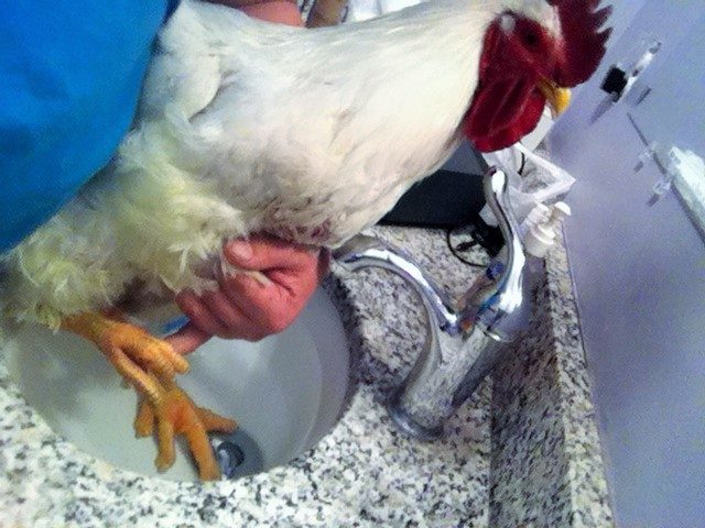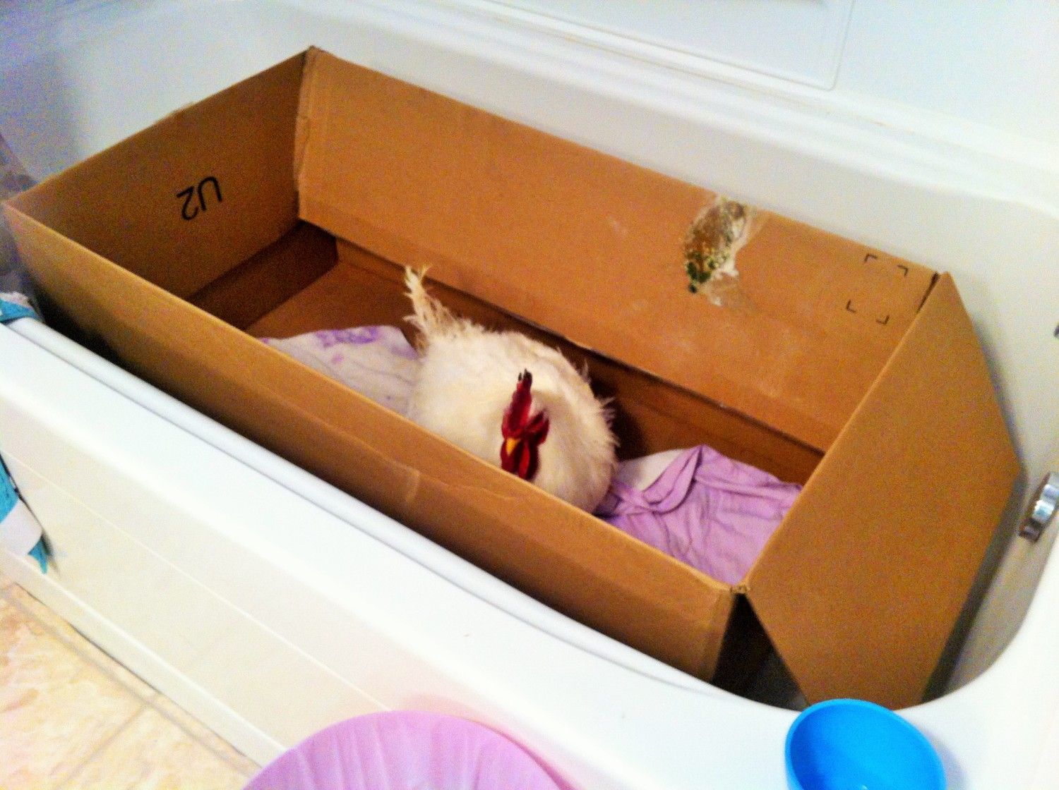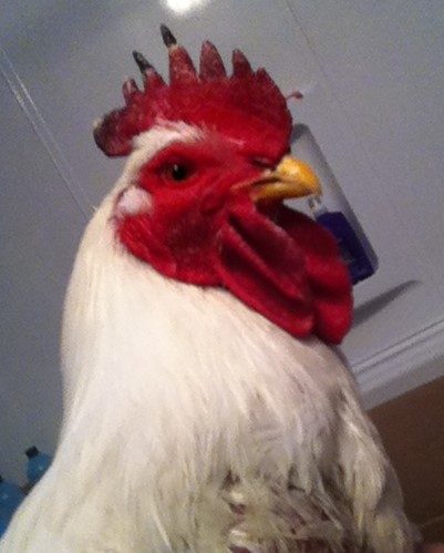 Bert is outside, It might be wishful thinking but he appears "better" he is standing, he crowed some, and is eating oats..