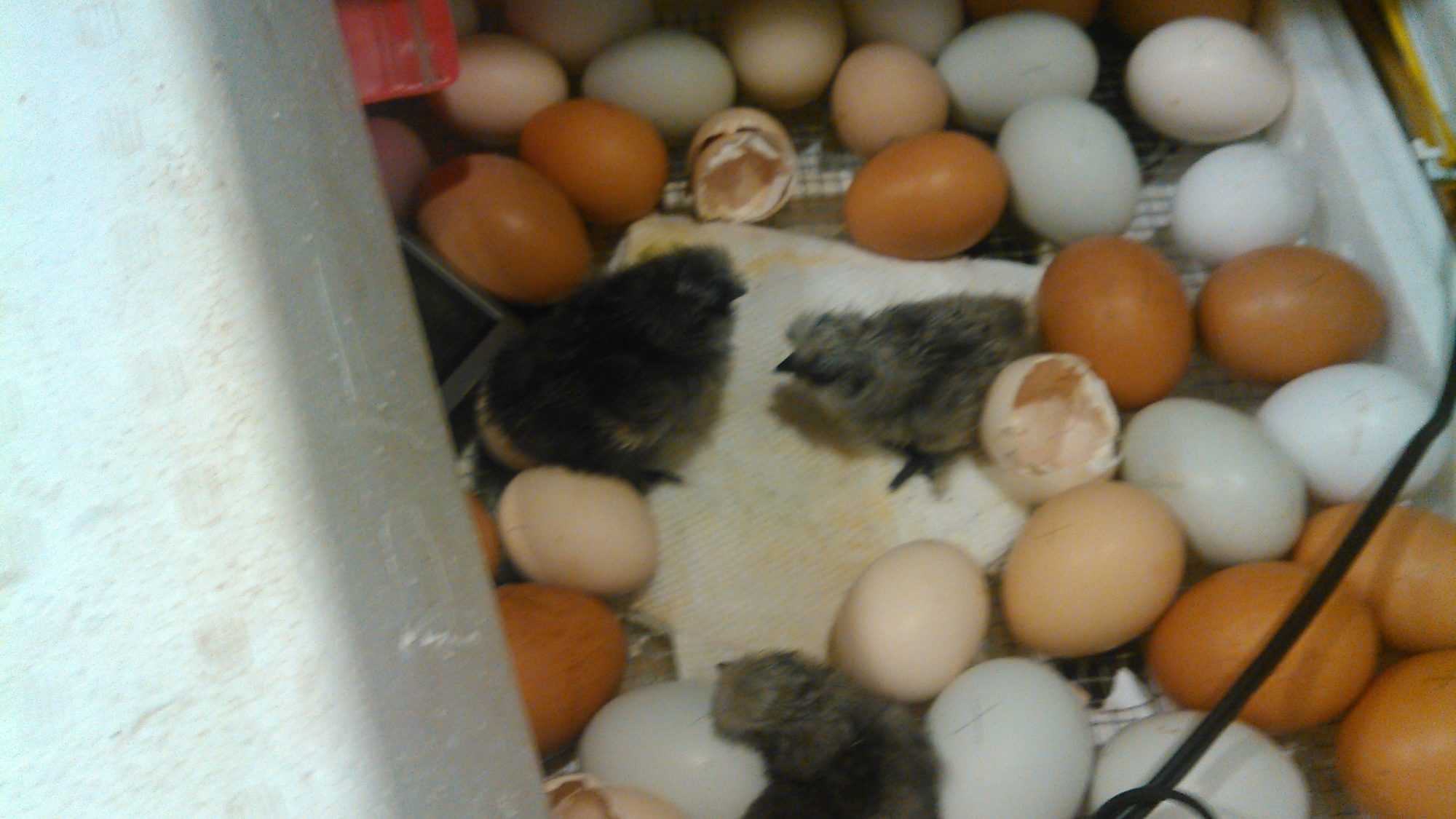 The three eggs she was setting were very dark inside when I candled them, so I put them in the incubator with a new batch of eggs. ALL THREE OF THEM HATCHED! I'm so excited!