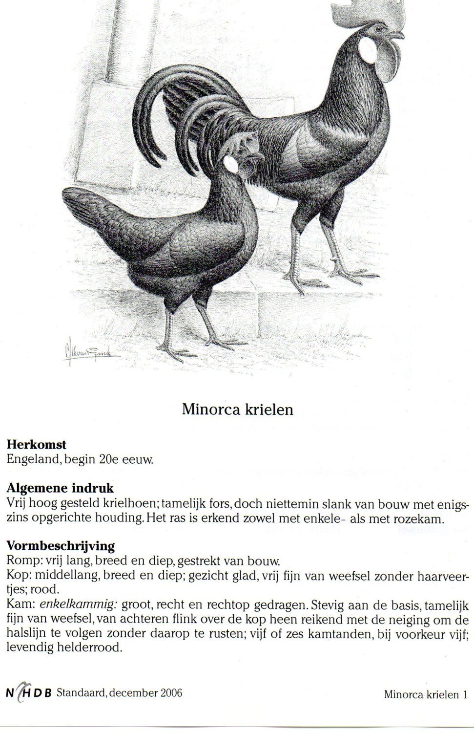 This is how a Minorca should look like in my eyes: Horizontal back, almost horizontal tail. Not to much down (the fluffy feathers), long legs, big comb that falls to one side, big white oval earlobes en big wattles. Dark brown eyes. A slender posture or build and from the shoulders to the back it should be like a triangle shape or V-shaped. The wings should not be longer that their rear end. Black beak and legs with white foot pads (and maybe white nails, I like the white nails, usually they also have the whitest foot pads)
