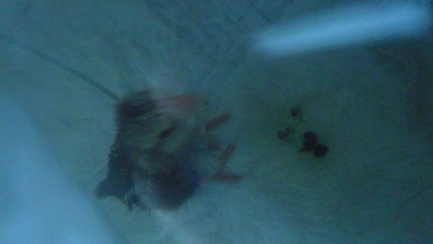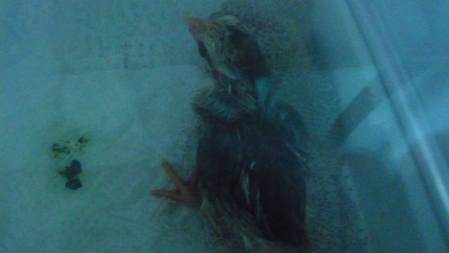 First baby out of the egg and chirping but very quietly. I hope he or she gets louder and maybe encourages the other baby to get out of the egg too.