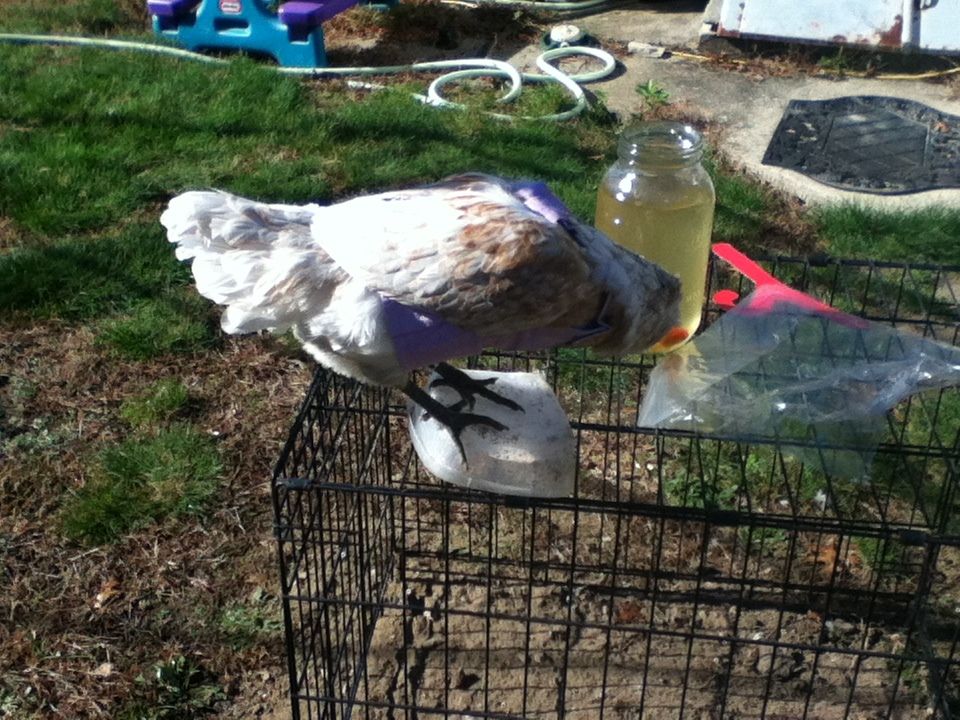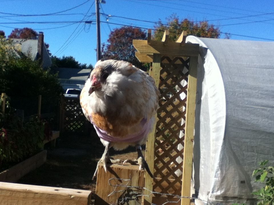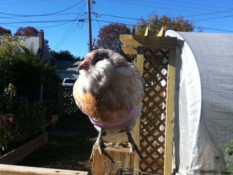 Miracle has her halloween costume now. It's a purple dress with a pocket in the front that her human's going to put layer pellets in: