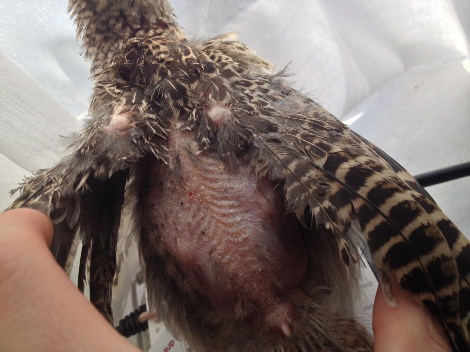 One has bare patches where her wings meet her back and lost all her tail feathers; she's one of the bossy ones, more likely to bully than be bullied. The second ,has a completely bald belly and is starting to lose some around her neck, and she's been spending a lot of time burrowing in the dirt.