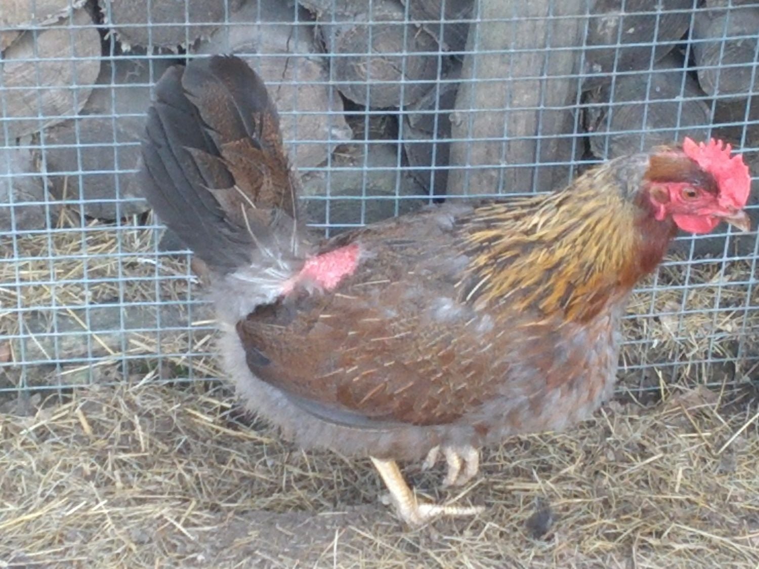 This one belongs to my aunt, I am not sure of all the breeds that she has, but she has around 10 hens and I am pretty sure no roos, all of the hens have this same feather loss. Very confusing.