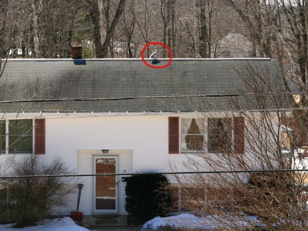 She's nearby alright. Two questions now answered. Her wing obviously was not clipped as she is roosting on my neighbors roof.