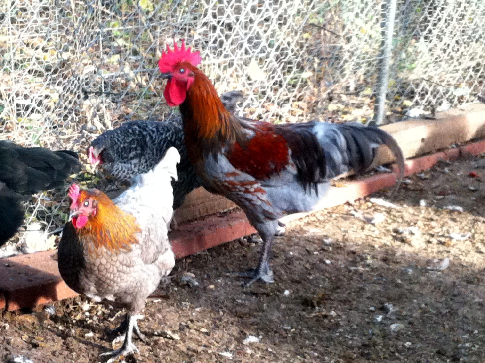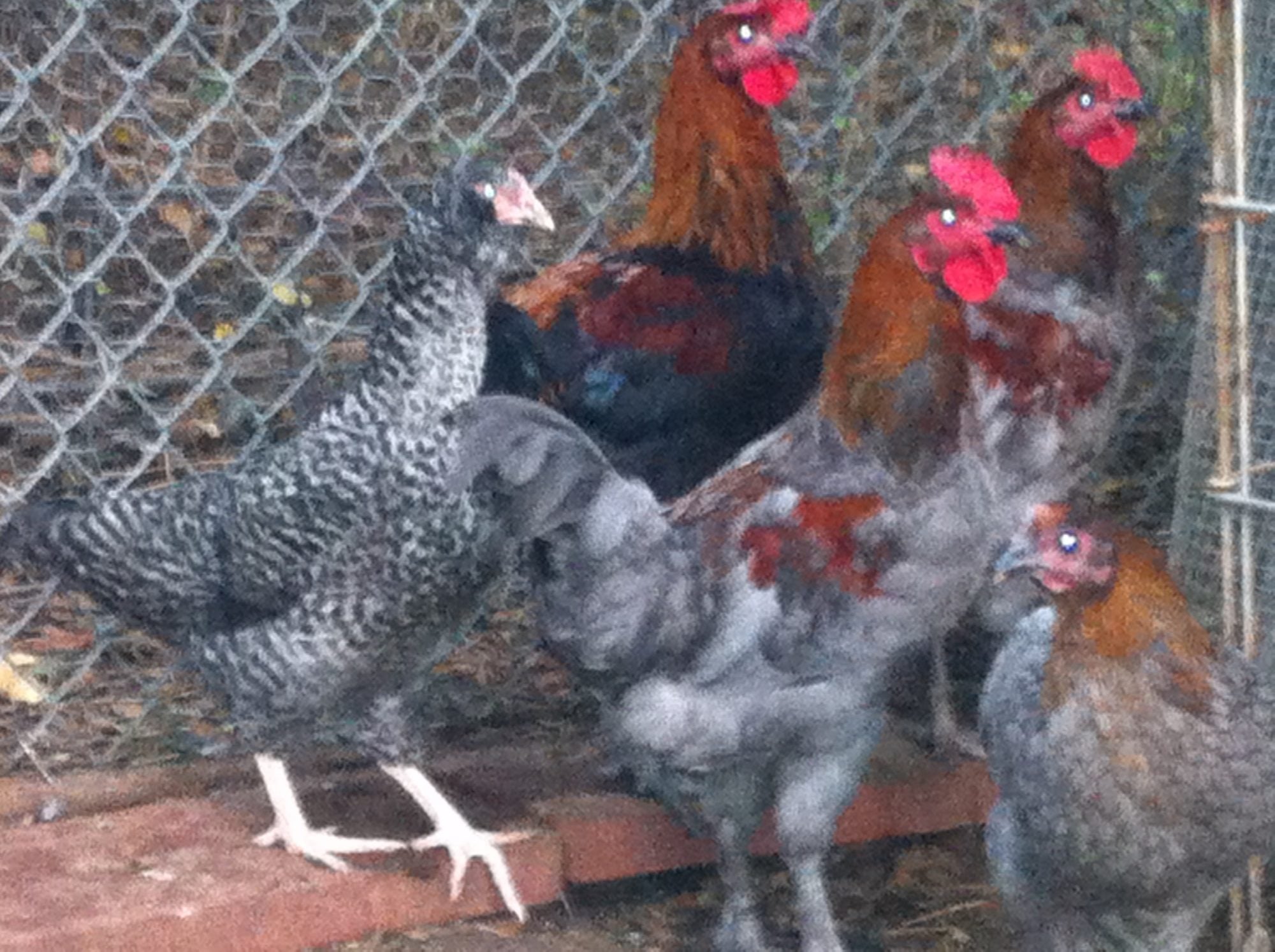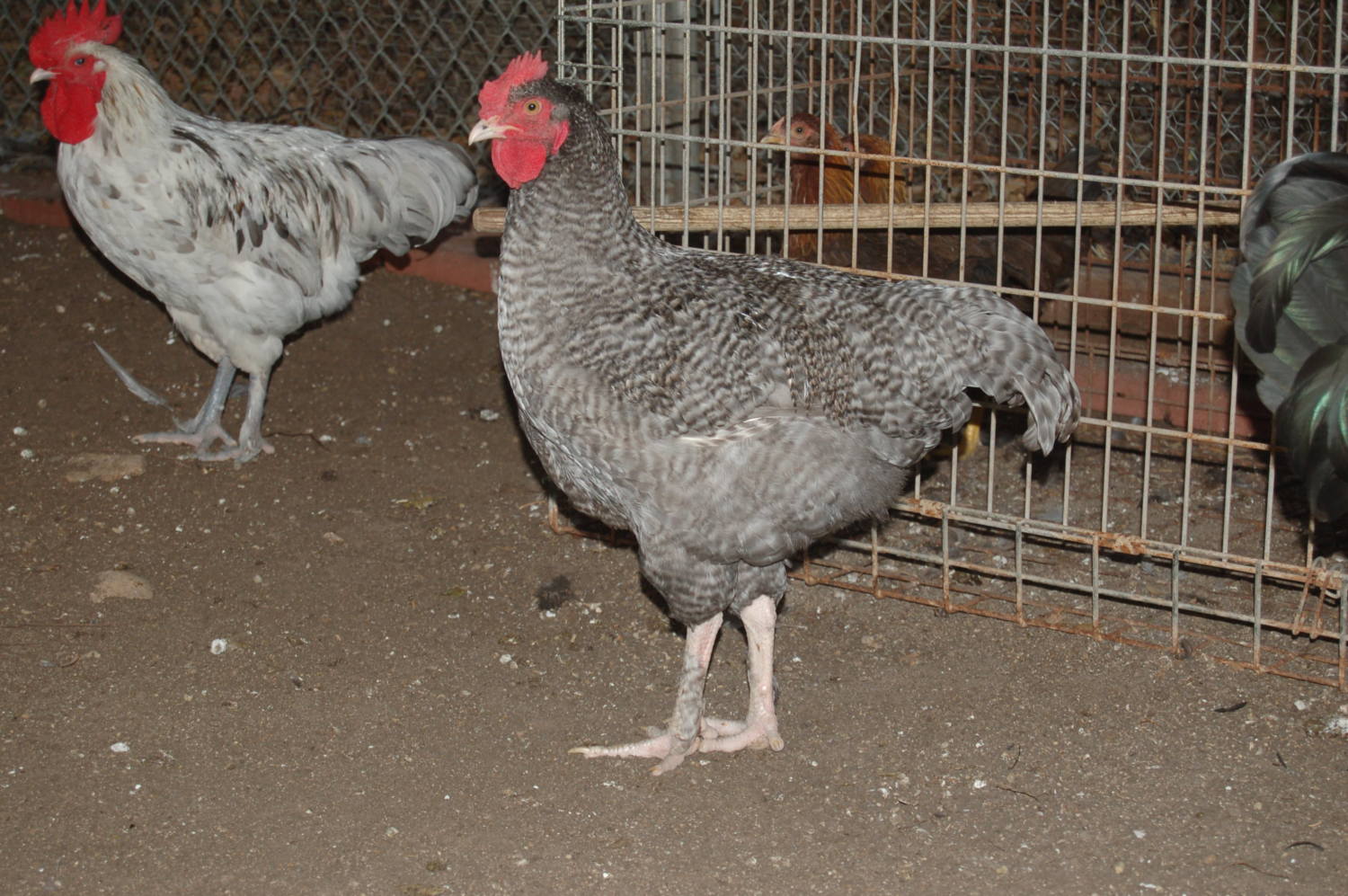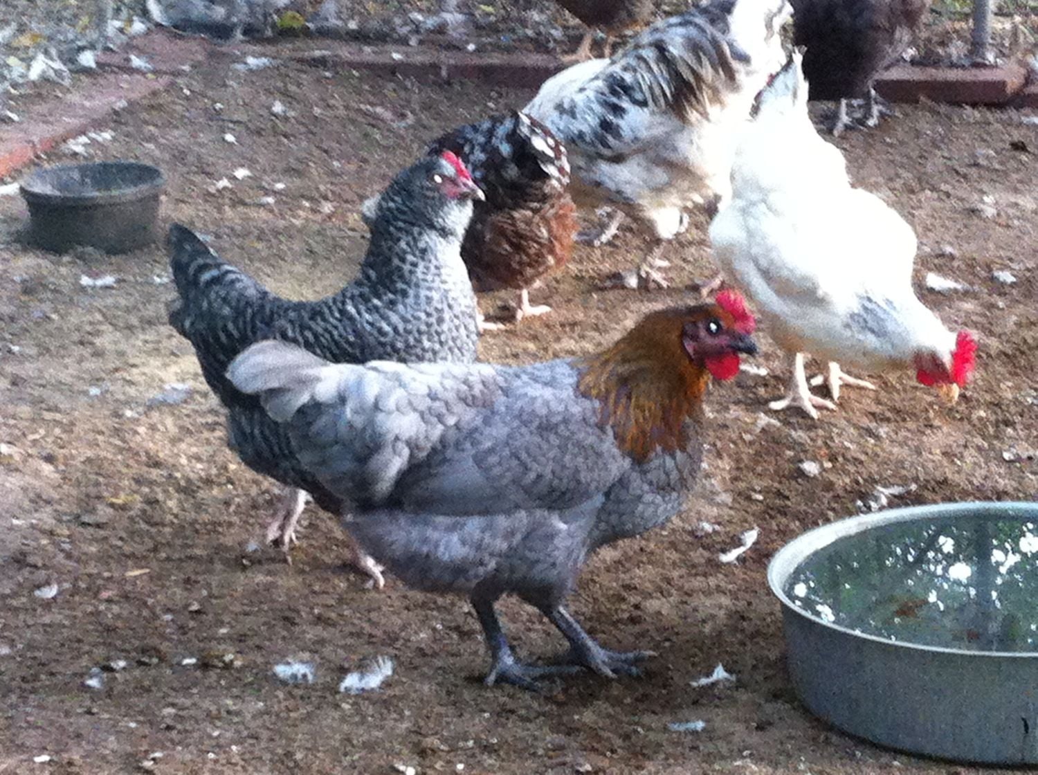 The barred pullet is a marans x lavender Ameraucana,with a Delaware hen, Splash Marans and SS butt in background.