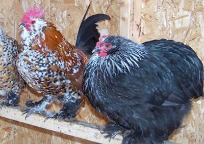 The parents - Mille Fleur bantam rooster x Birchen Cochin bantam hen -