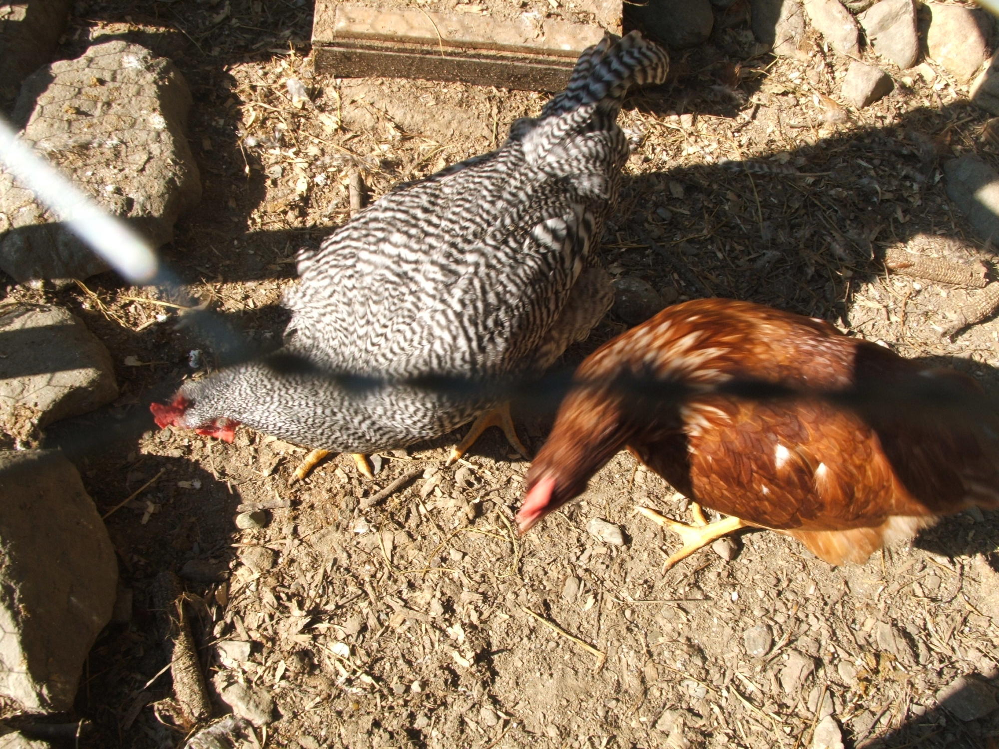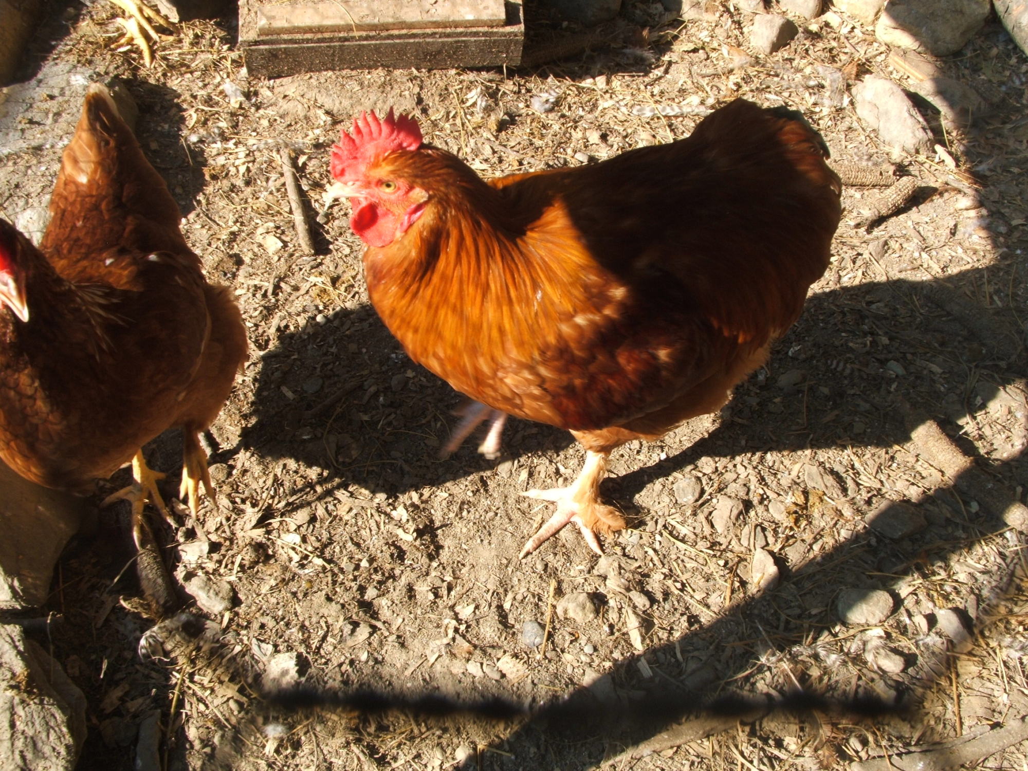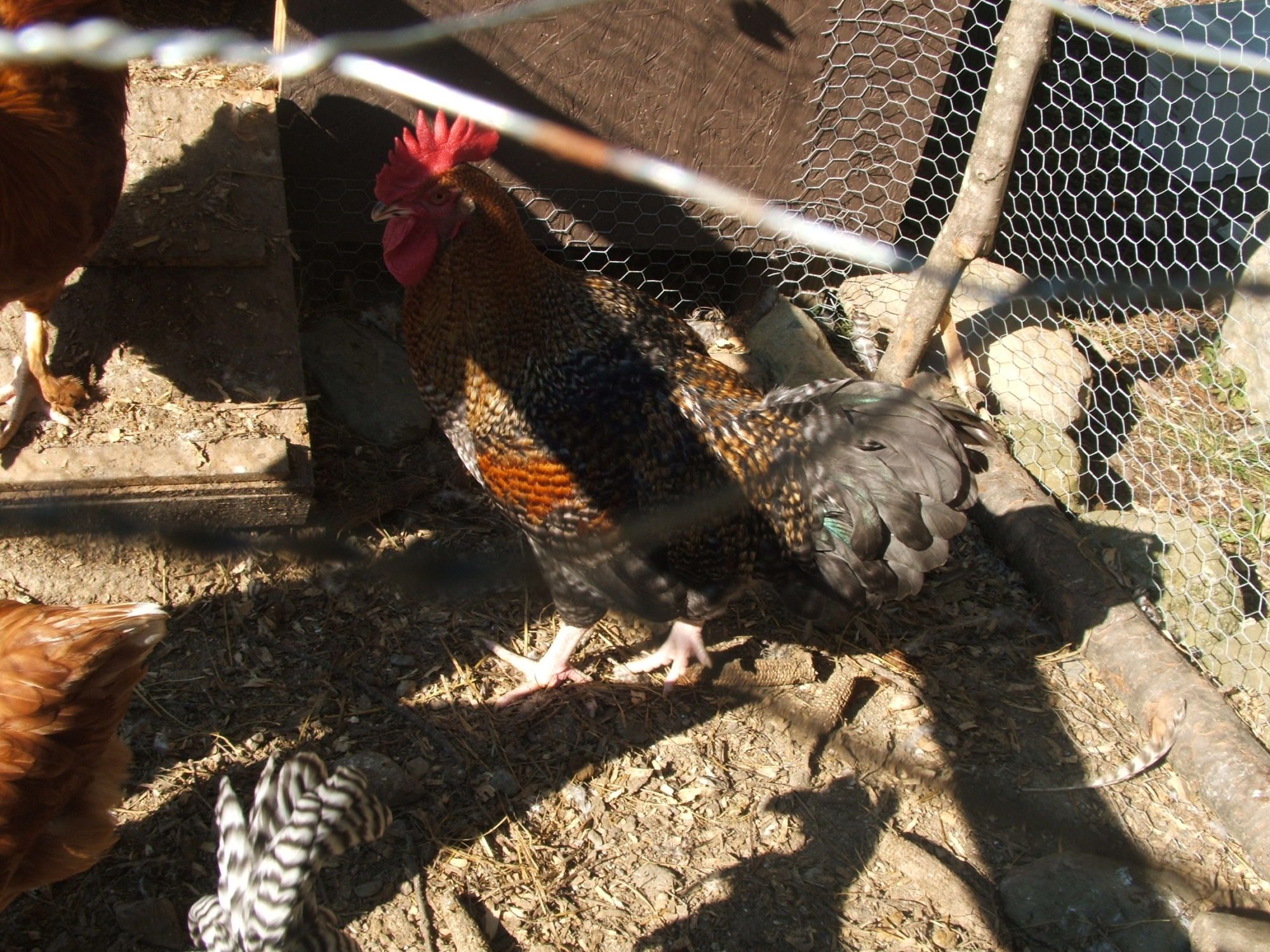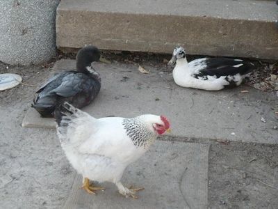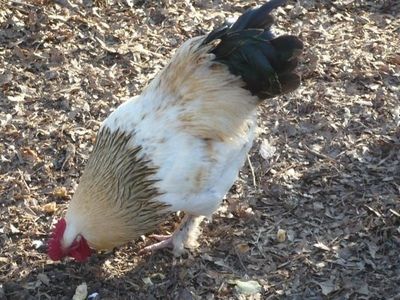 White Orpington Rooster cross Black Star Hen. His name is Chicky and he was somewhat friendly. Another Barred Rock rooster beat him up and he broke his leg. sadly, we had to kill him and the Rock. the rock was overly aggressive and chicky was on his way out any way. They did get the honor of being the families Sunday Dinner.