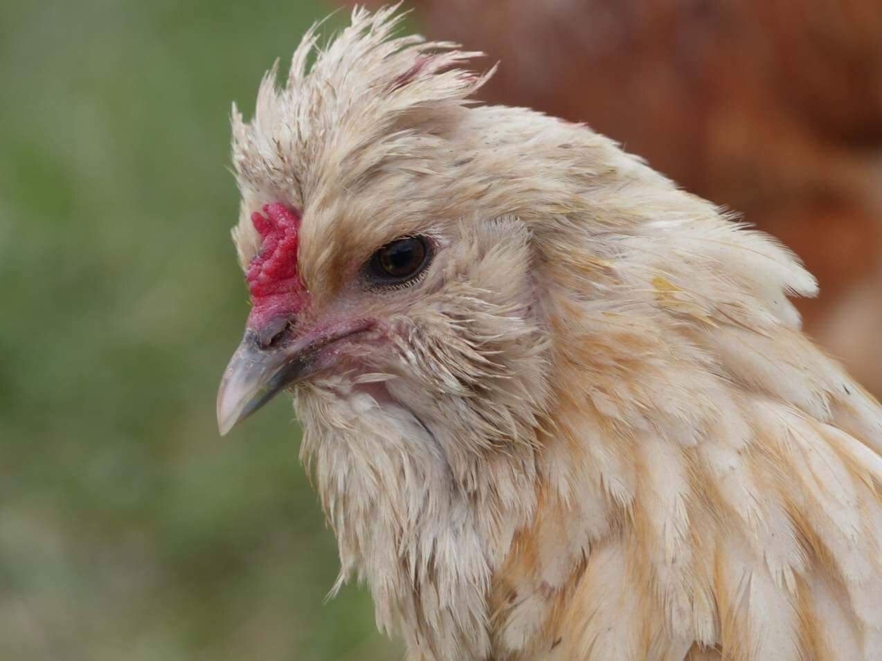 Thought I'd share one of my pretty crosses, she's the outcome of a Buff Laced Polish rooster over an off white Easter Egger hen. I named her Clementine and her twin sister (yes I have two!!