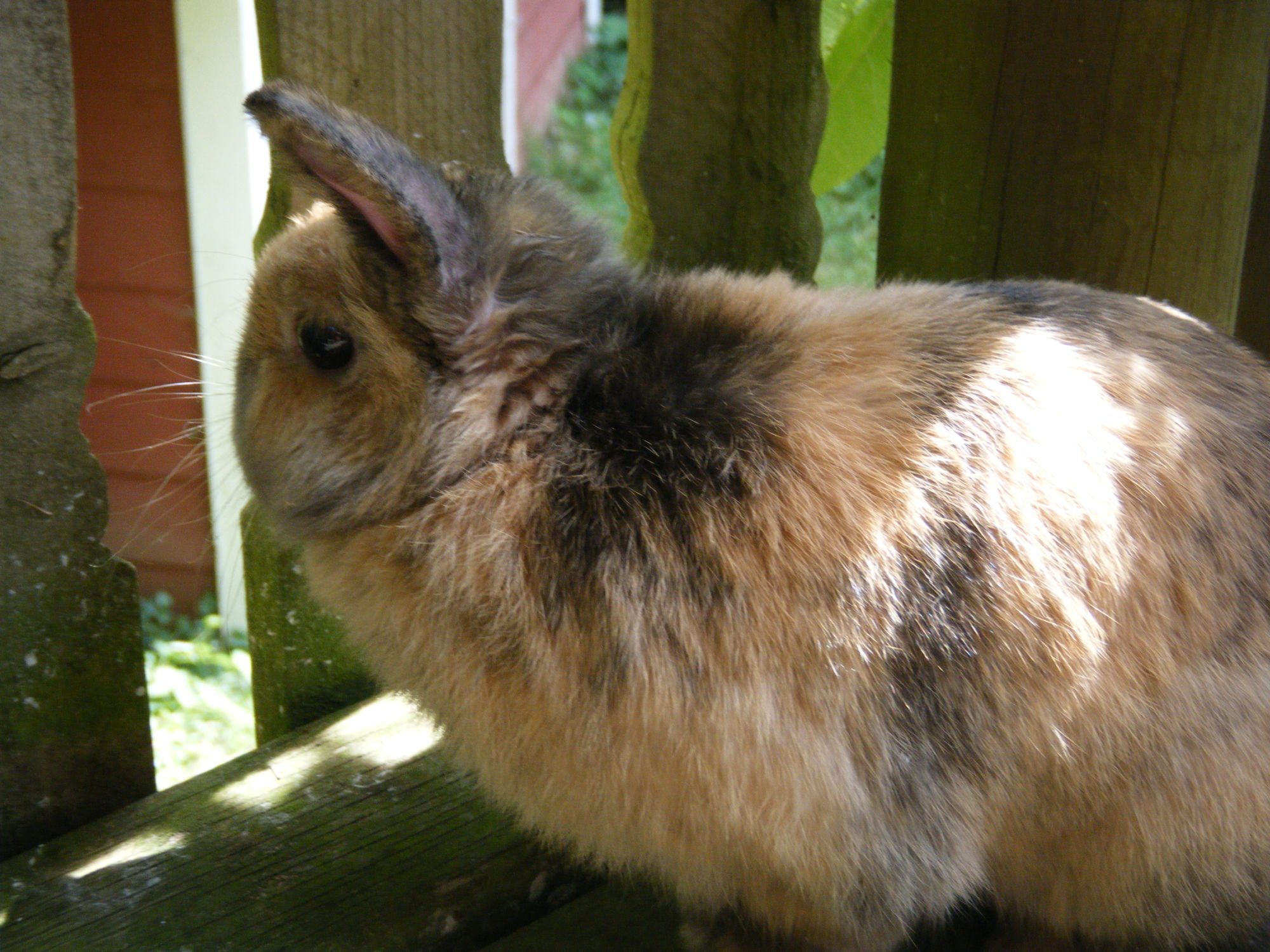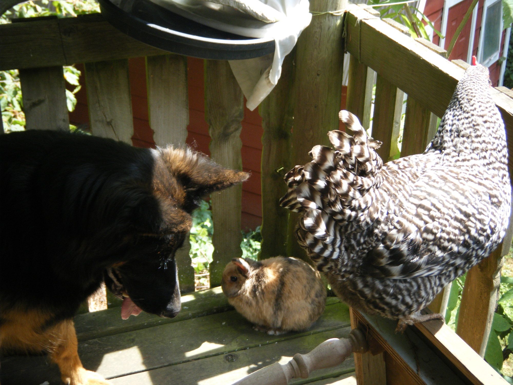 Yes that is a German Shepherd a rabbit and a chicken living in harmony! :)