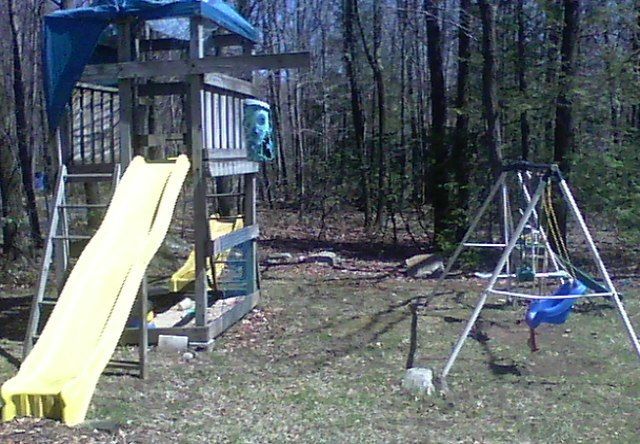 A coop I saw someone was currently building made me wonder if treehouse + swingset would get us anywhere. But now that I think of it - that swingset there is very unstable (notice the rocks we use in attempt to hold it down when someone swings).