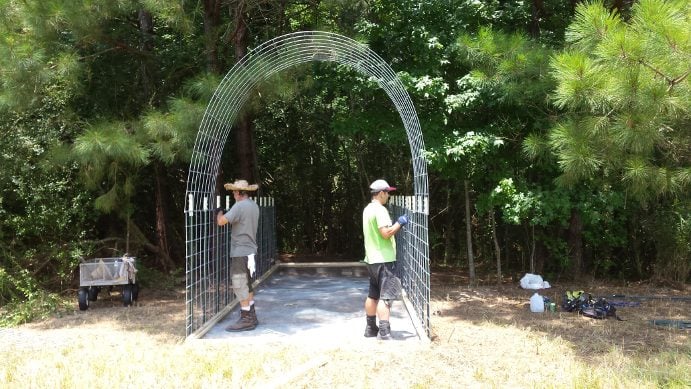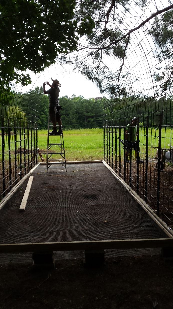 1) Foundation. Ground was sloped so the foundation had to be raised to level to make the arches true. It was decided to make a "bathtub" of the hardware cloth instead of digging it in to the perimeter for predator protection, because of so many roots in the ground and also it would have entailed digging next to the buried t-posts that depend on the integrity of the ground to stay anchored. We'll fill it in with sod complete with insects and plant cover to entertain the keets during their "confinement" period to ensure they know this is home. Will leave some slope for drainage. Will eventually be using deep litter method.