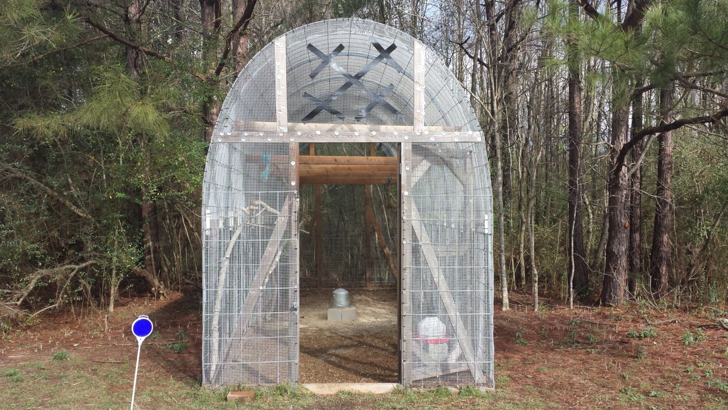 Hardware cloth: Each pass over the arch and down to the ground on each side is 24-ft or so, which meant that 1 roll of 1/2-in hardware cloth (48" wide) covers 2 panels. With 6 panels total, that meant it took 3 rolls for the roof and lengthwise of the structure, then another partial roll to cover the ends. So you'd need to buy 4 rolls total for the shell. We also covered the floor with hardware cloth, which took basically a whole roll. So that would be 5 rolls total, roughly, but do the math to be certain. (see below for story on floor covering)
