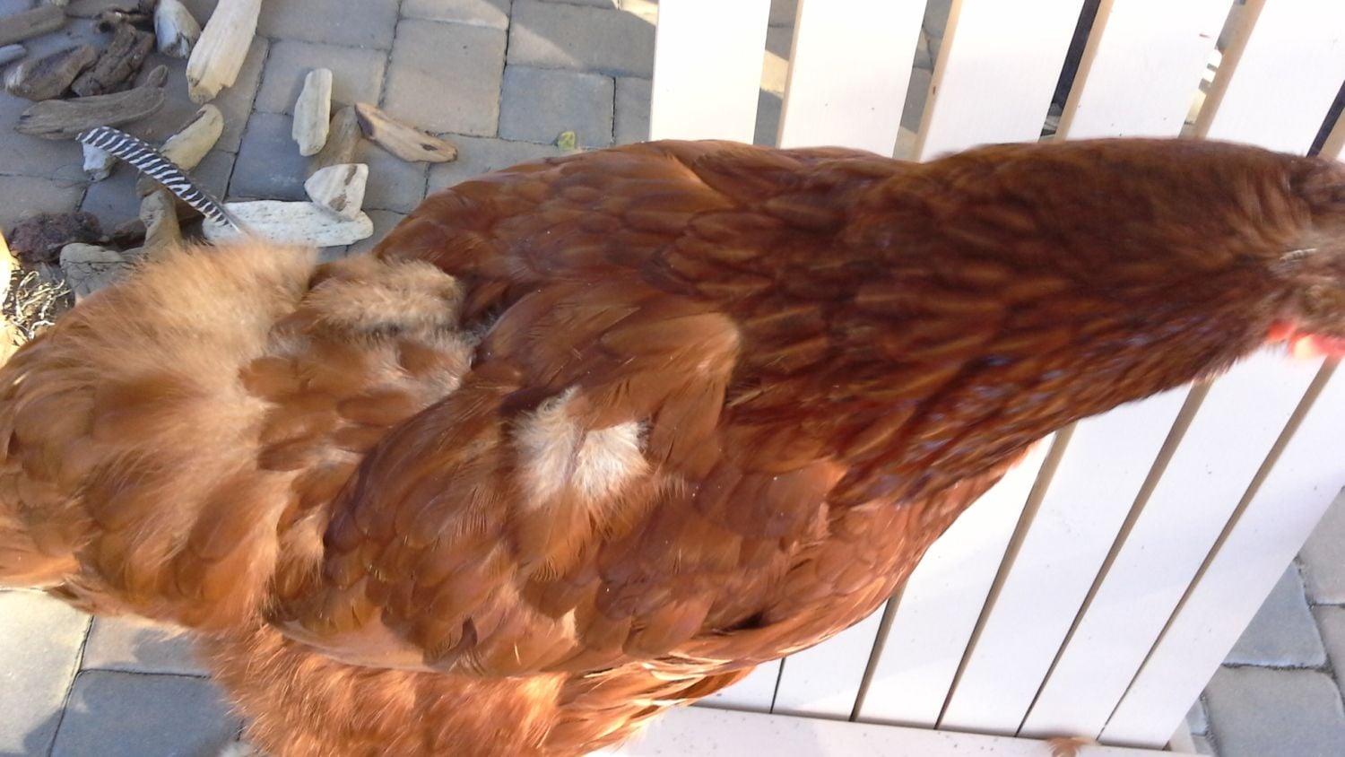 My chicken has started to molt. She has already lost about 200 feathers. The thing I am worrying about is how she has a bald spot on her back, between her wings. I don't know if that would be a problem, since we are in winter... please help!