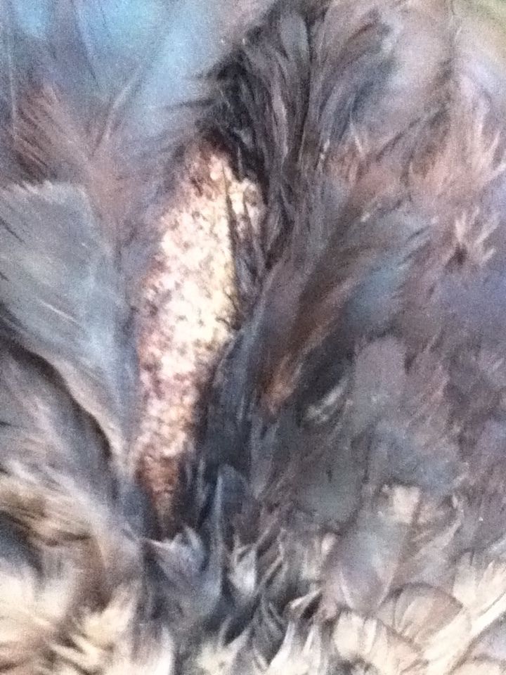 Well later that same day I notices an explosion of feathers. At first I thought she was being pecked at. This morning I took our garbage down to the curb, And when I got back she just happened to shake and poof feathers every where.