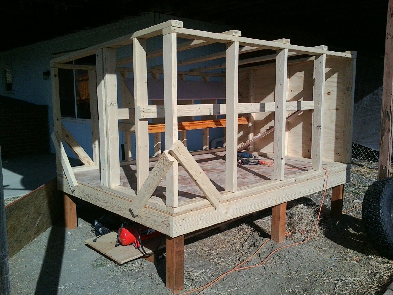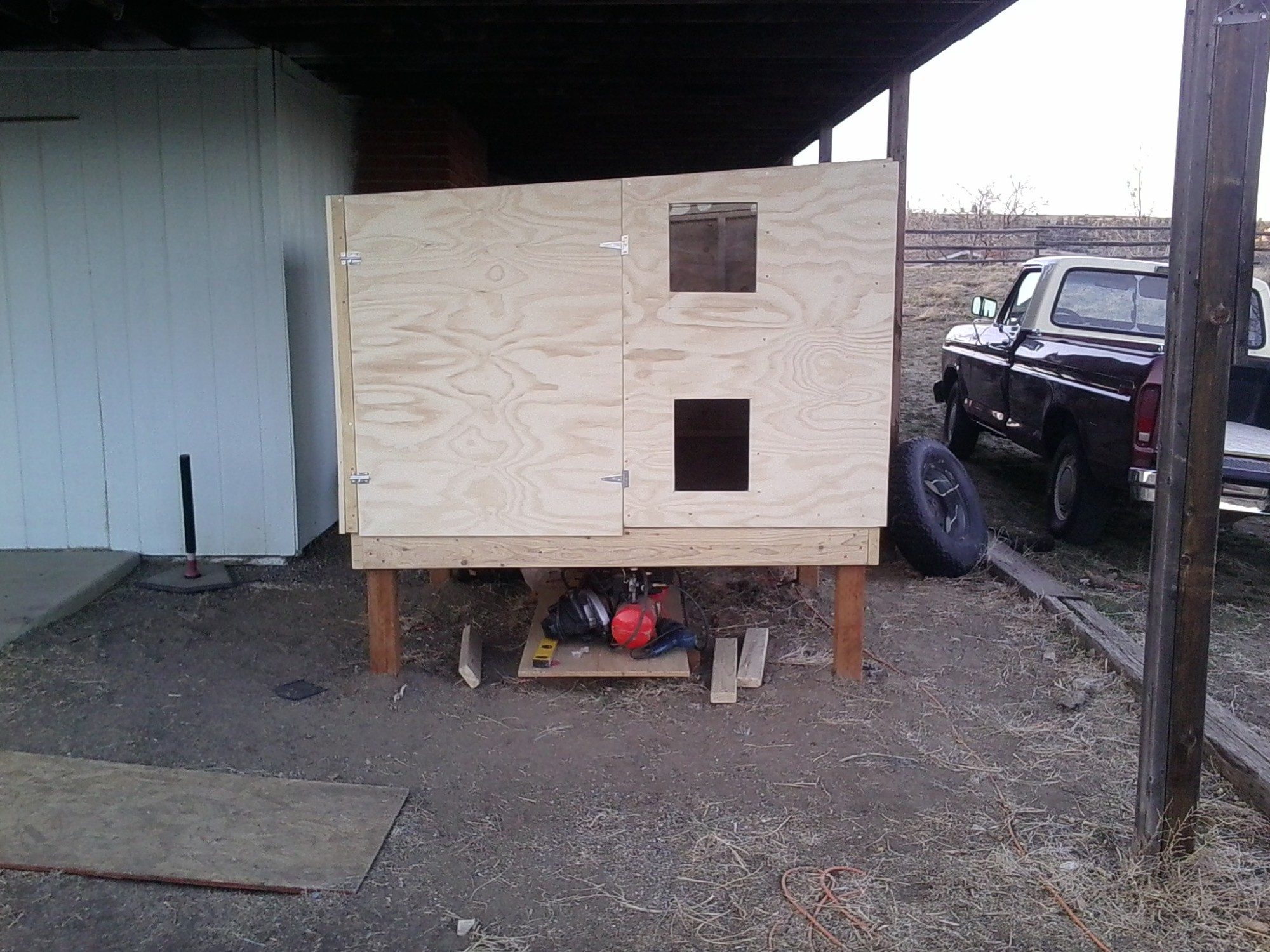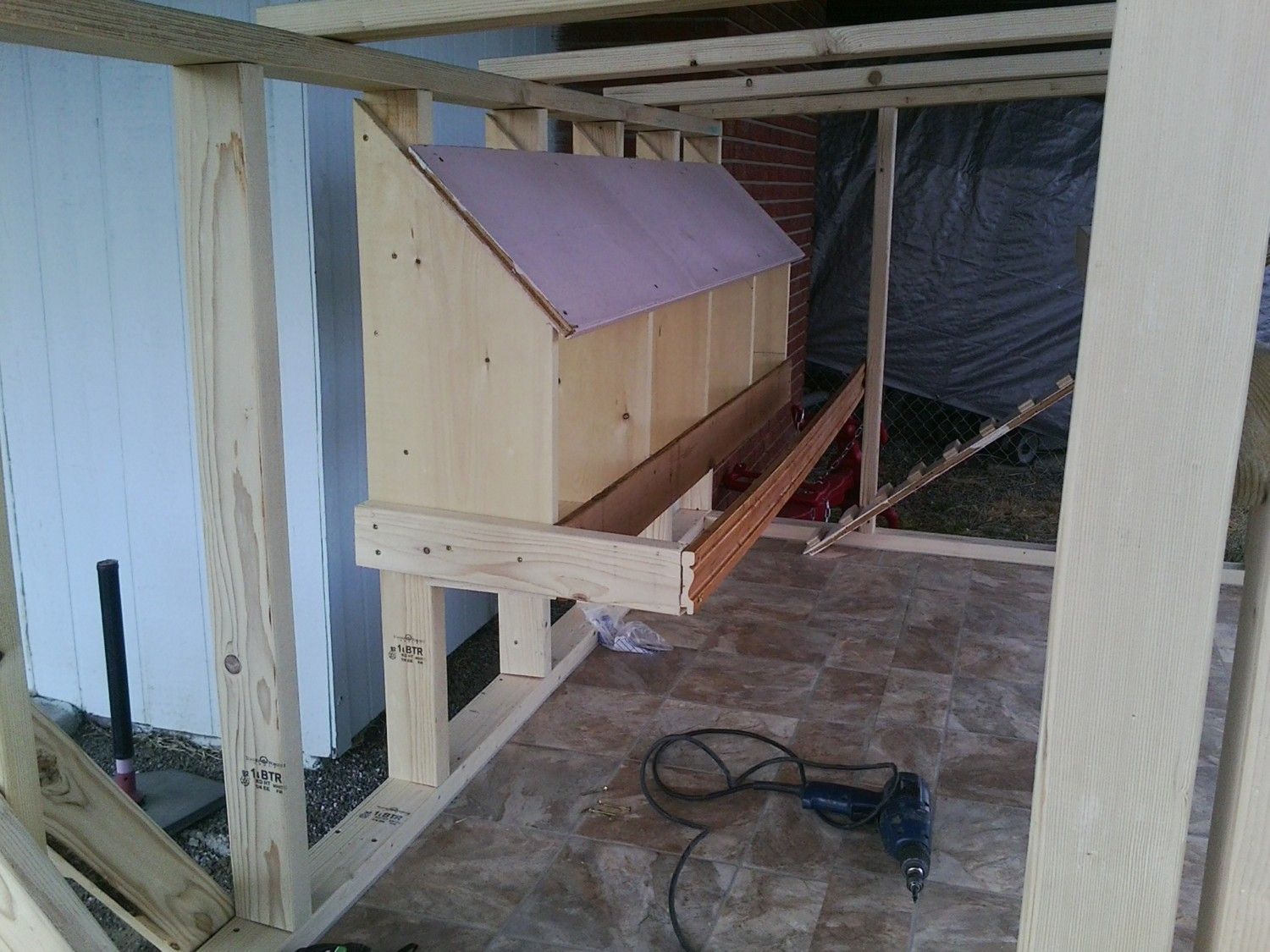Completed framing on the coop yesterday, and all interior stuff (nesting boxes, perches, ladder to perches, etc.). Sheathing the coop tomorrow. The most time-consuming part will be cutting out those little windows and ventilation holes and attaching the plexiglass panes and vent screens. Also, the shingles, but probably won't get that far tomorrow. Looks like rain/snow on Sunday!