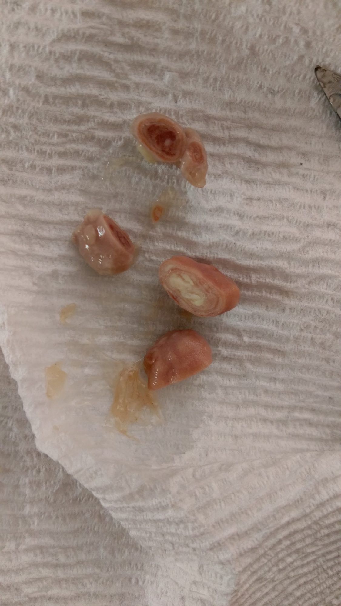 Our favorite special girl Allie, a 2.5yr old ISA Brown, who is just coming out of a molt and hasn't laid in 2 months, just passed this thing, it was originally all in one ball of oozy-gooey mass, when I separated it there were 3 different masses, I cut 2 of them open. I'm not sure if this is something bad that should be brought to a vets attention. She is otherwise, healthy and happy and her usual self. Thank you in advance