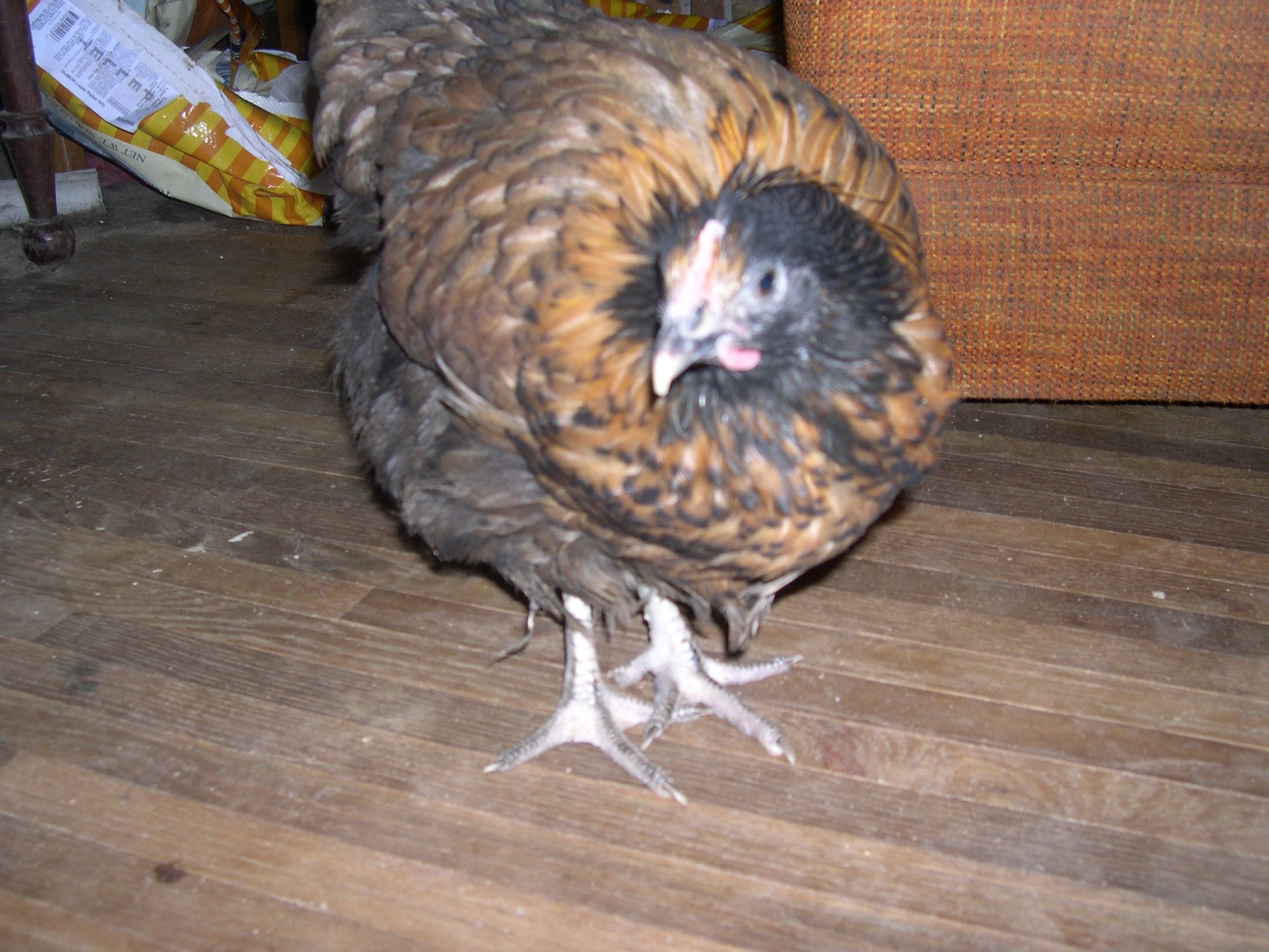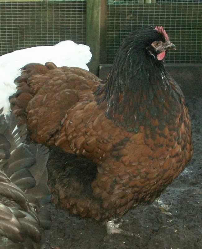 Here is an interesting twist on Spangled. I was told by a top notch geneticist that this pullet MAYBE not able to throw this look. For now I will use her with my Brown Red cockerel. But by summers end I will use her with a quality male. I really like her type for a 4 to 5 moonth ole. This is one of my BUSTOFF line specials. My friend Harry said this shows that BUSTOFF have the mottling gene in him and I should use my 2 Black Mottleds with him. Harry knows his shtuff!