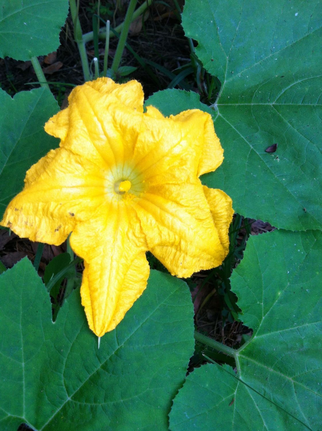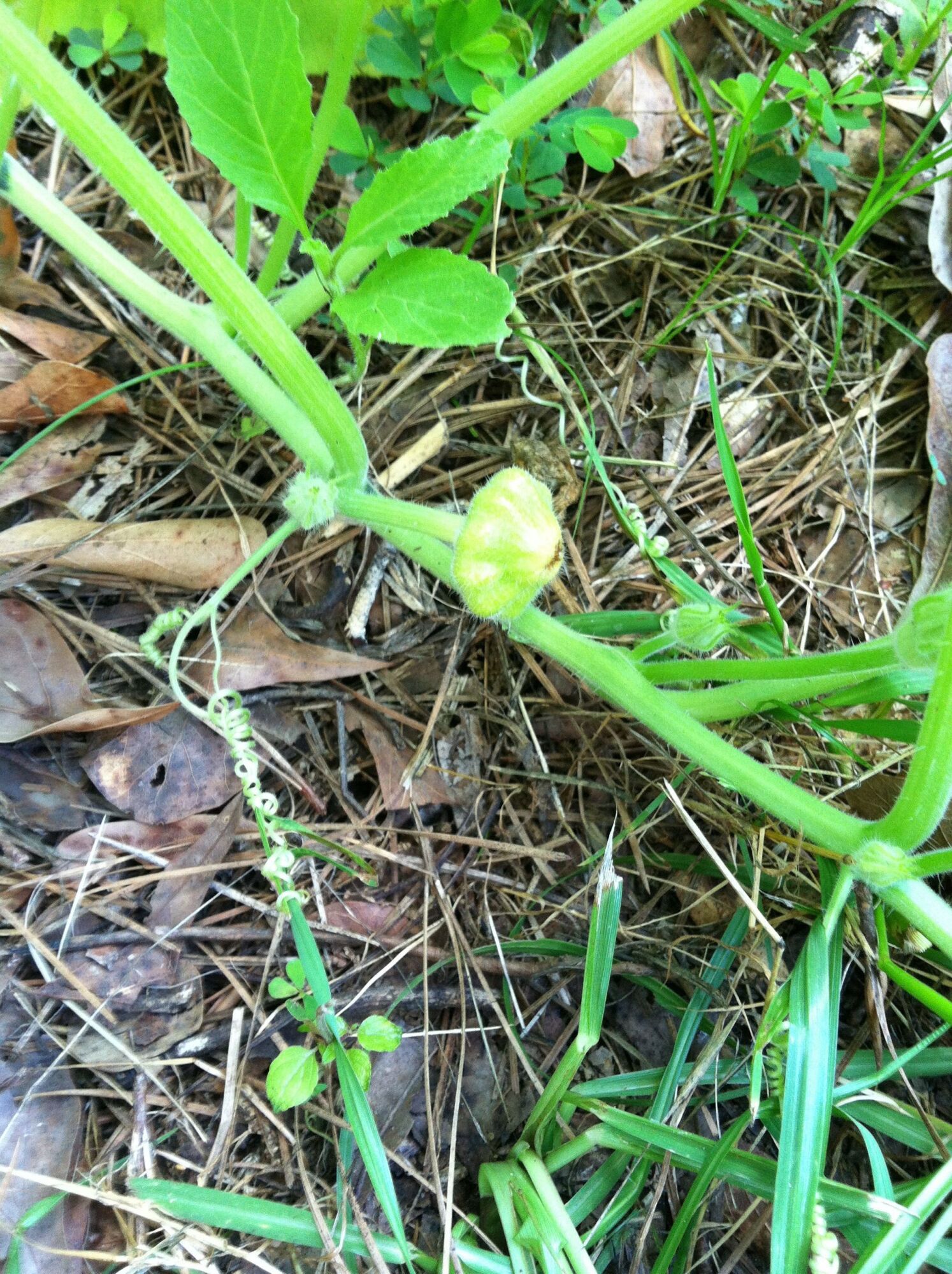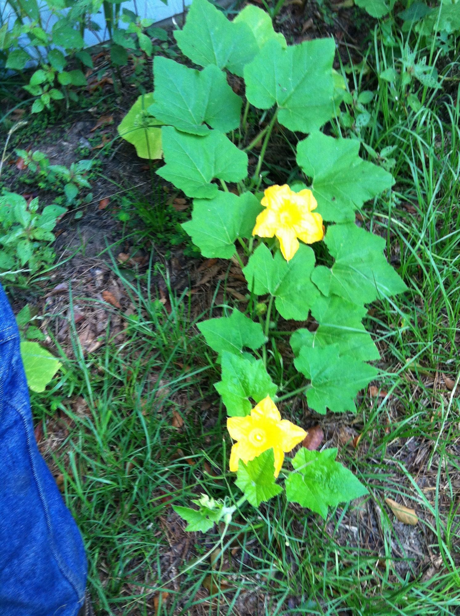 A volunteer patty pan squash plant I found, something cool about squash is they have both male and female flowers, only the female flowers make fruit.