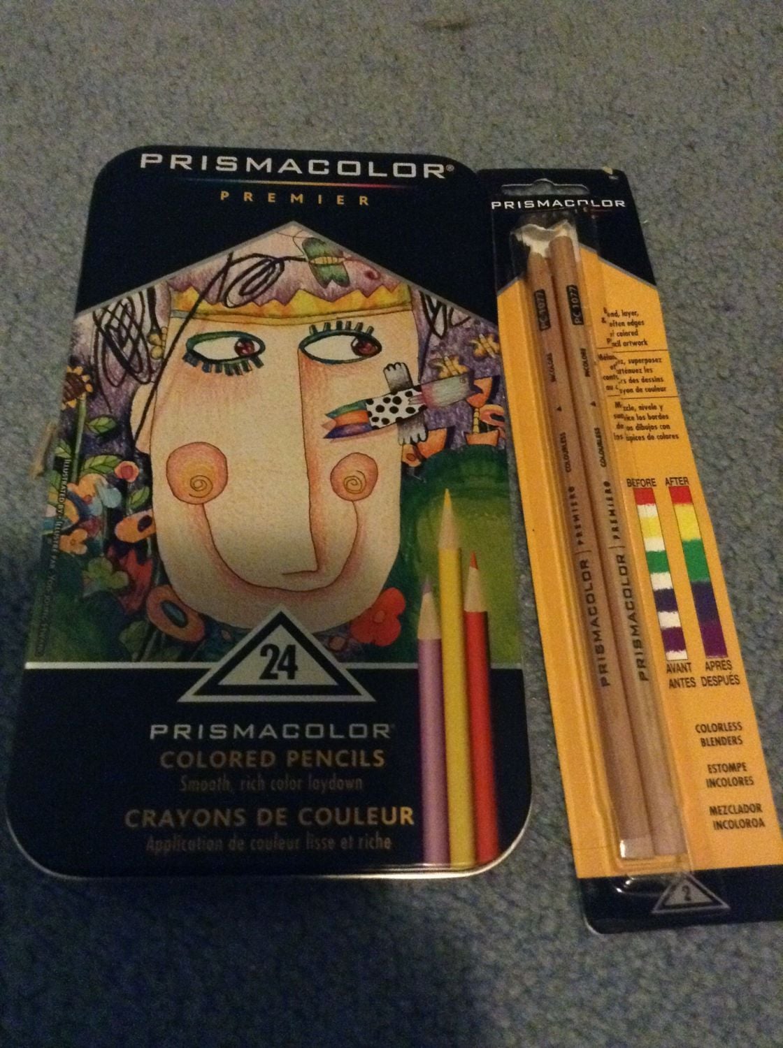 I'm so happy! I knew I wasn't going to get the new bow I wanted for Christmas this year, so I asked my family for something else I've been wanting for months, PrismaColor pencils. I asked my family for the 12 pack of them, since they're not cheap. I believe they're about $22.00 for the 12 pack, and that's a lot of money to spend on colored pencils. We open our Christmas presents on Christmas Eve, so imagine my surprise yesterday when I opened a gift from my grandma and found not a 12 pack of pencils, but a 24 pack! Then I opened one of the gifts from my mom and dad, and found a two pack of PrismaColor colorless blender pencils to go with the 24 pack of pencils from my grandma! I was so happy!