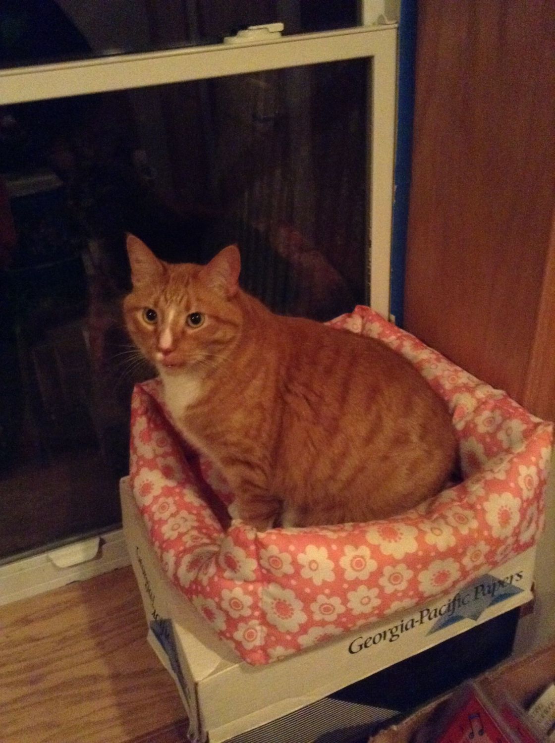 Our church had a rummage sale today, and while I was looking around at stuff I found a pink flower print pet bed for $1.00, and I thought, "Hey, we should get this for Ginger." So I had my mom get it, and I put it on the window ledge in the basement. I go downstairs to check on the cats a few hours later and Marmalade is just hanging out in Ginger's girly bed.![]()