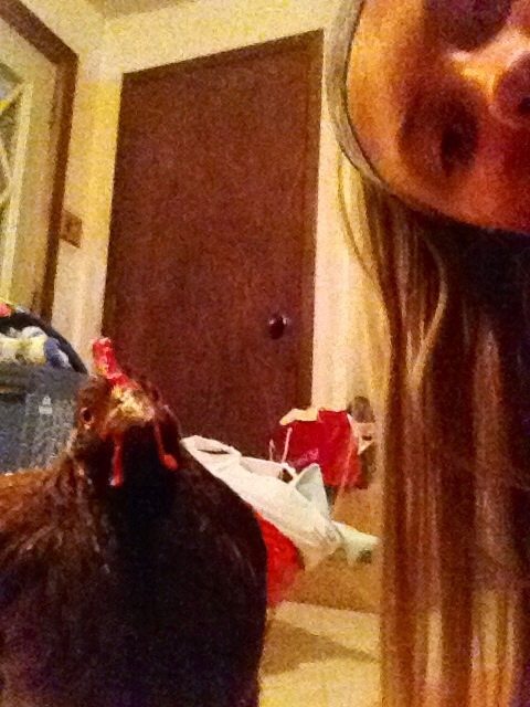 Low quality pic with a high quality chick. (And yes, our kitchen is full of boxes and bags of stuff right now.)
