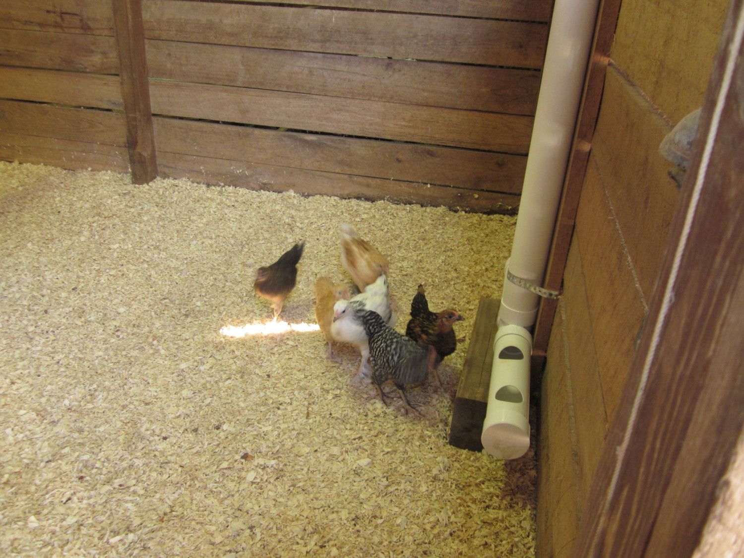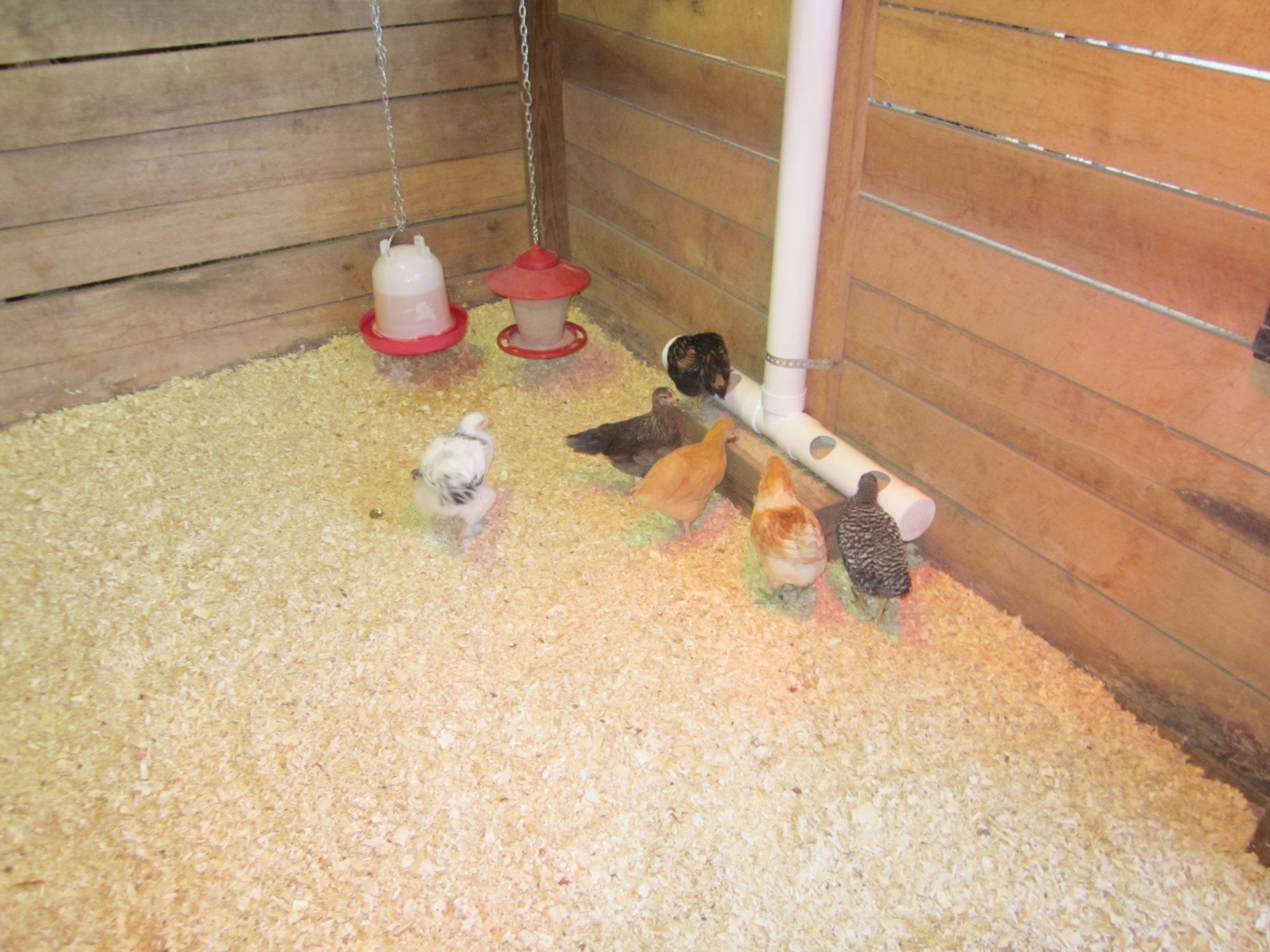 Yesterday (Sunday) was moving day for my girls. They are 6 weeks old (tomorrow).They lived inside in the back bedroom for their first 2 weeks, then moved to the garage for the next 3 1/2 weeks. I just finished enclosing one of the 12 x 12 stalls inside the barn for their new home. While my son finishing wiring the top, I built them a PVC feeder.They were a little timid to start with but soon started running and jumping all over the place. Next weekend, I plan to build a watering system using the water cups.