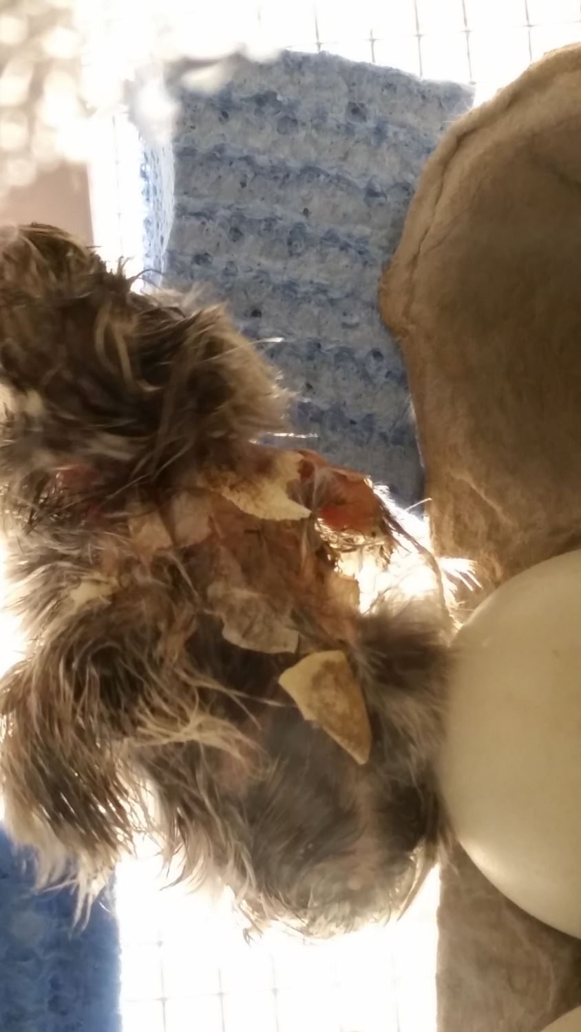 A warm damp cloth can be used to remove the rest of the hatching-ick from her.
