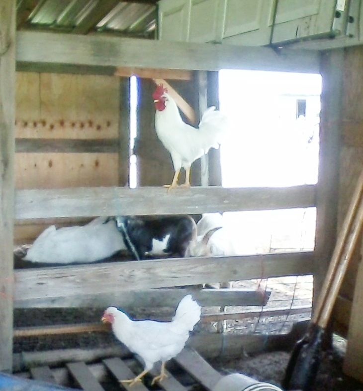 At least I do have a nice Ameraucana cockrel coming along, same age, with muffs, tuffs, color, dark legs, pea comb and ALL that. So guess who is going to be a very busy little man? The TBW guy is nice but, has a split comb that flops -- what does THAT mean?? -- but the 3 ladies have the tiny nothing ones. They look like the SBEL, as 2 are white with black specks, one is grey. Of the 2 white, one has yellow & one grey legs.