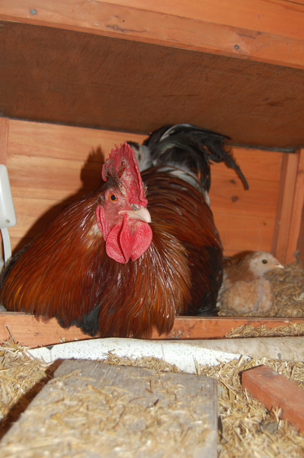 I had had her separate to hatch and raise the chicks. One day I noticed a hen paying way too much attention to my roosters comb and sure enough I watched and she was pecking at it. I had to separate him so he went in with Mom and the chick. They were quite the cozy family and all was right as rain until mom up and left them for the hen house. Now there is just the two of them and they are as cute as can be. I just hope no problems develope....