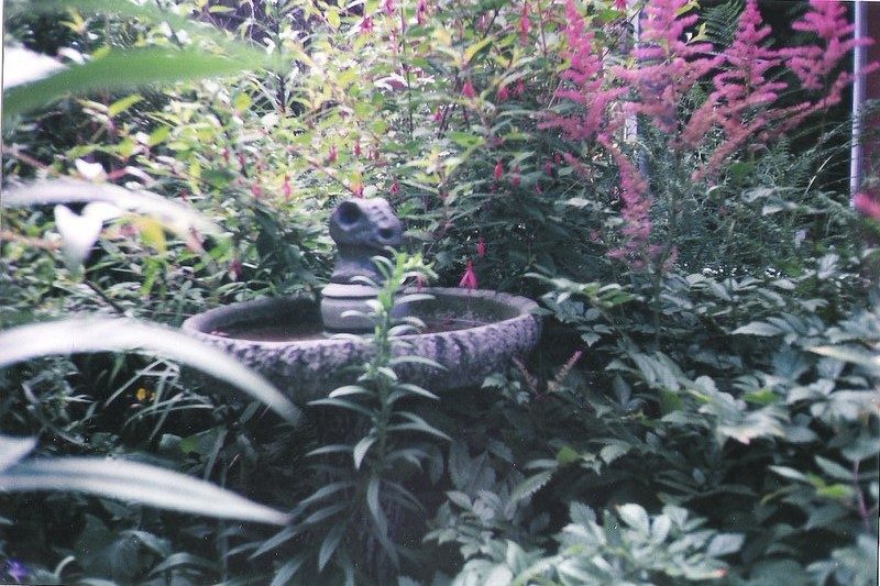 In the shady garden. Pink Astilbe, hardy Fuchsia, and just starting to come up, Giant goldenrod. My son made the dinosaur head in sculpting class in high school. I had it in the bird bath for a long time. I think he snatched it and took it when he left home. I loved that little dinosaur so.