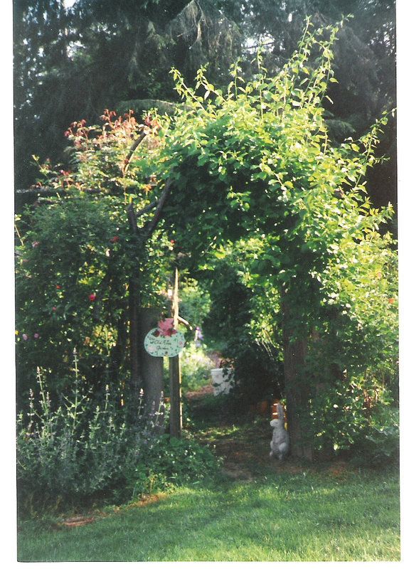 The first arch was put in as 4"x4" supports with just pruned branches from a wild cherry tree set over the top.A rambling rose was planted on the left with a couple clematis at it's base. On the right was planted a bittersweet (Celastrus). It grew too robustly and really thickly. I moved it into the shrubbery and it took off. A friend made me little garden signs for all my different garden rooms many years ago. I still have them. Looking at the silvery perennial under the rose on the left is a Lambs Ears. Also a rabbit and deer proof plant! My children named the little bunny statue 'Benjamin Bunny'. He doesn't eat much. Hah!