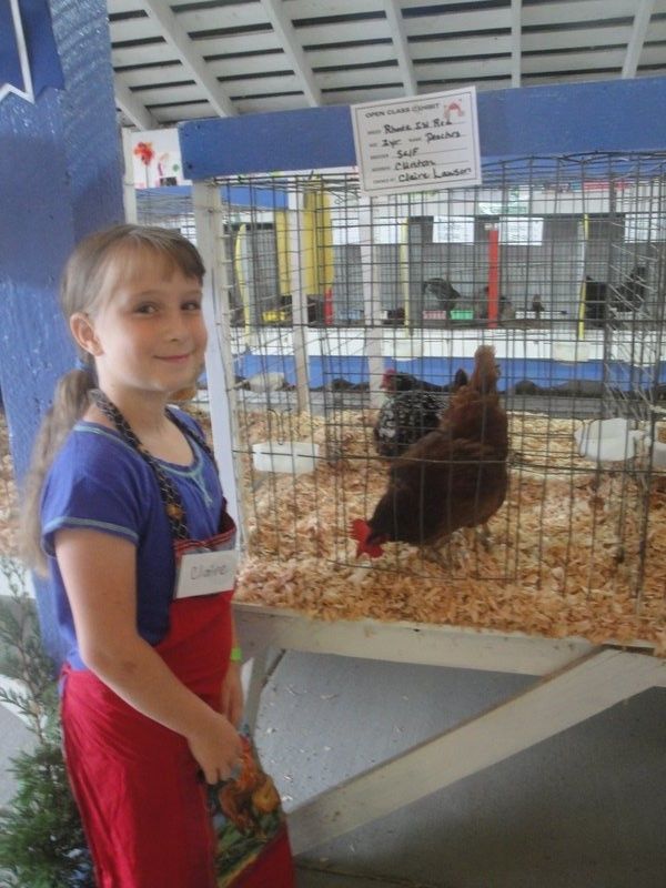 In the poultry barn a little girl was so proud of her hen. She called it a RIR but I didn't have the heart to give her the 'Production Red" speech. I took her picture instead. Who am I to be the old lady to ruin her day? She was such a cutie.