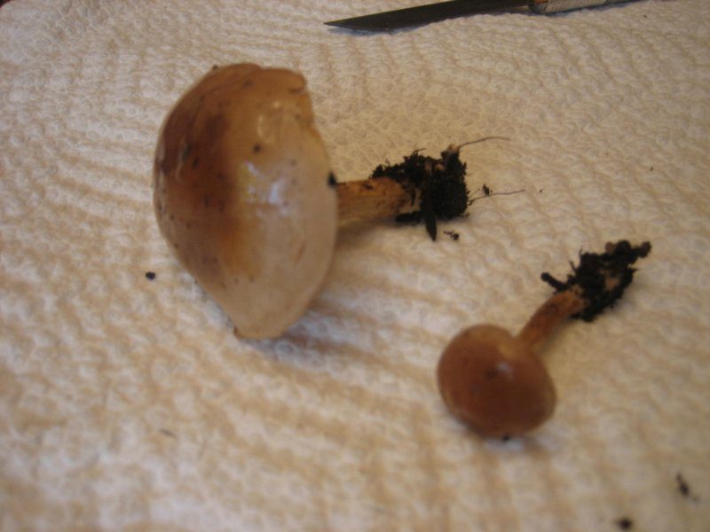 Remove the large cap of the more mature specimen. Gill side down on a piece of plastic wrap with a glass bowl over the top. Leave undisturbed over night.