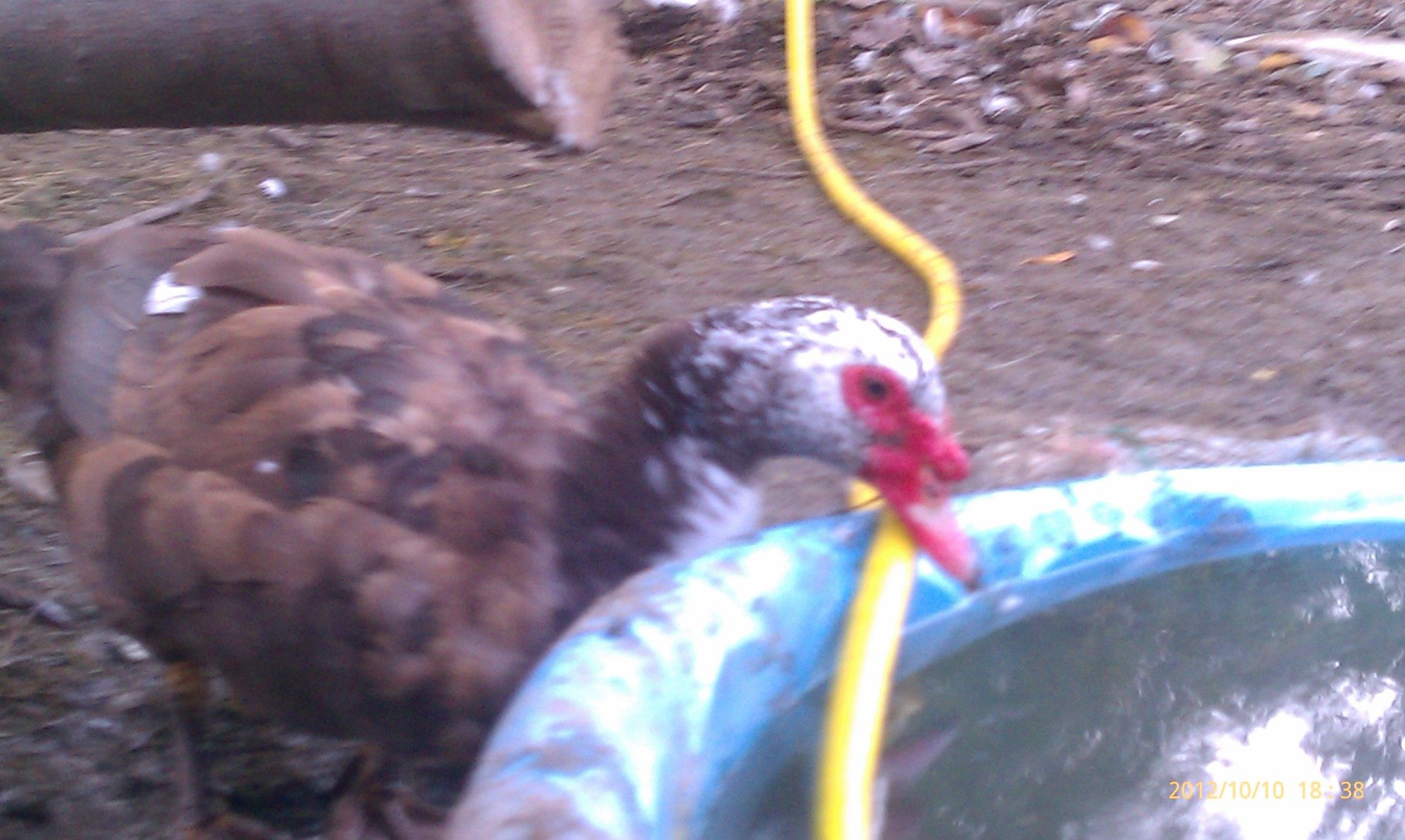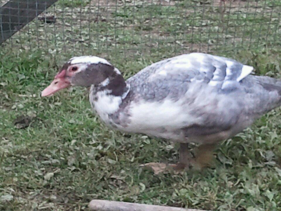My daughters 4 around late july. they have evolved a lot, and have similar red coloring around the eyes and the "knob" above the beak/nostrils. We were told they are Muscovy. Forgive my ignorance, i don't raise ducks myself, my DD started this spring. The pictures dont do justice, All 4 have a lovely blue green hue to their colored feathers.