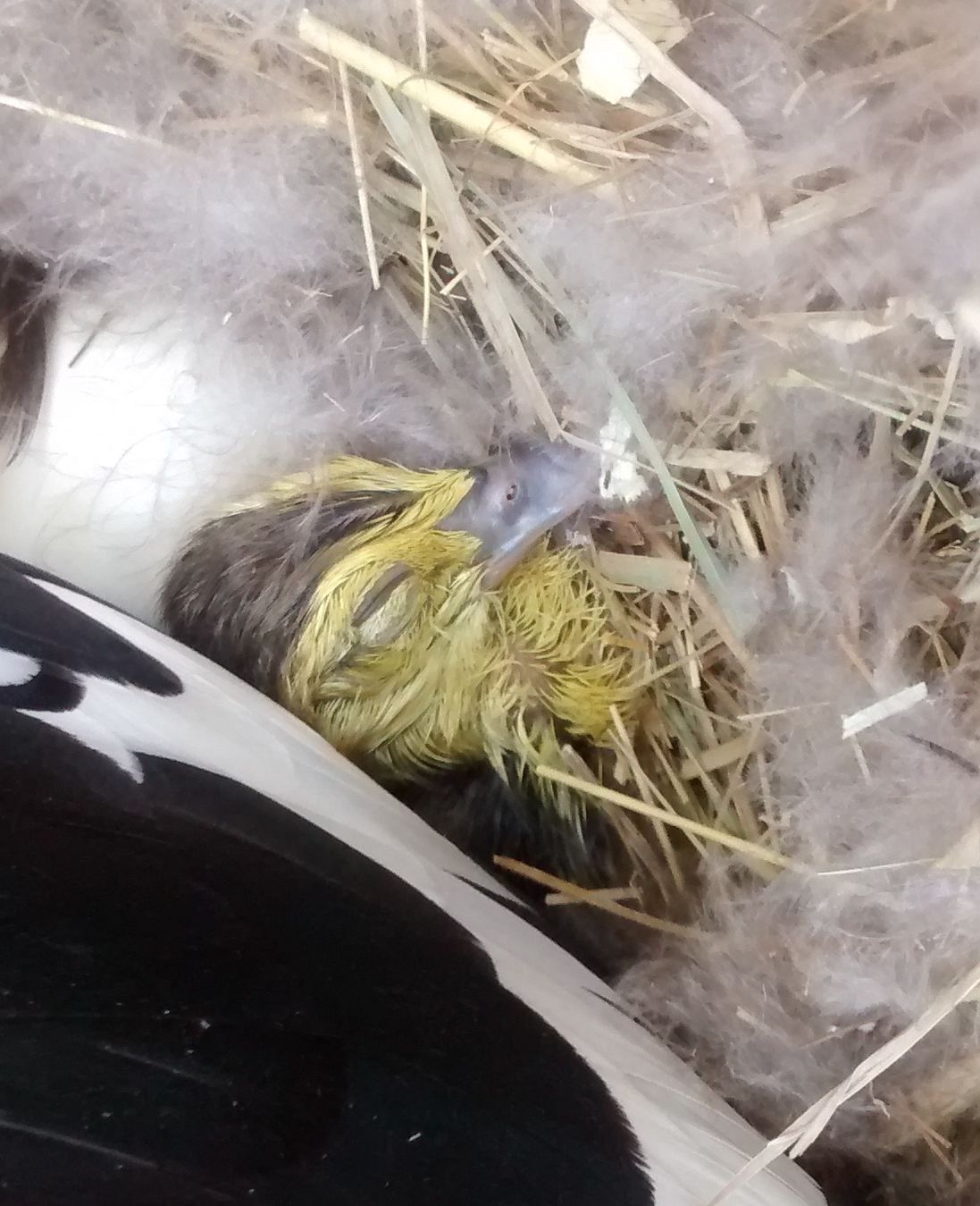 I just checked and this wee one was at the edge of her wing. Momma is very calm now that they are hatching. I petted her and she sat and just tucked in more feathers. I could see some eggs under her so tomorrow should be better. At least these will bond to momma unlike Turbo last year! Also the other duck is starting to pull feathers for her nest that now has 15 eggs in it, but not setting all day usually from 6pm till about 8am so far.