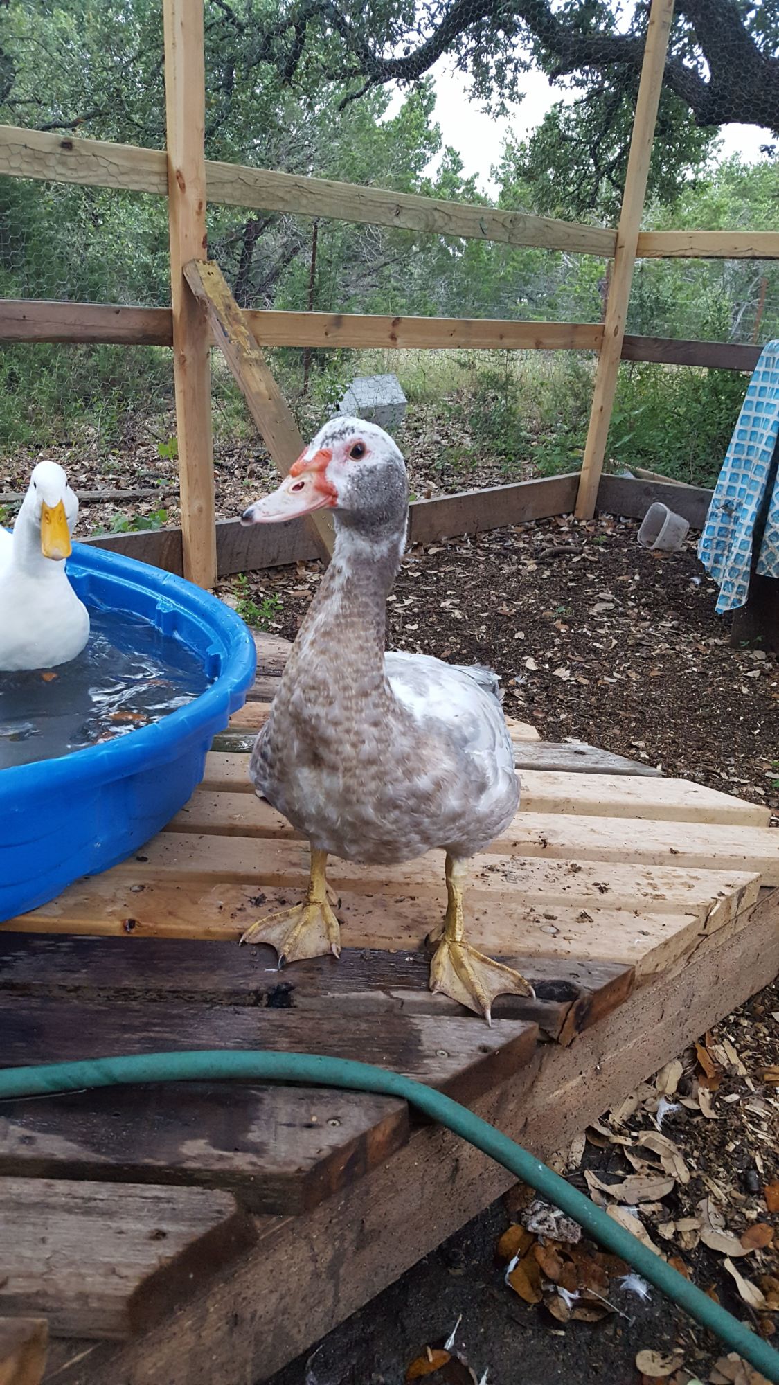 I know right?! This one has me in a pickle, there are characteristics of both. The muscovy is about 5 months old, and I guess they are just a larger breed than my pekin and swedish blue, but the muscovy has the biggest feet and claws. It's been biting at the chickens lately too, but that may just be a dominance thing. We may just have to wait and see! He/She was mad at me here.