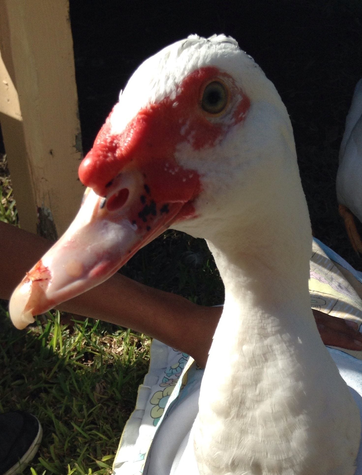 Help!! My muscovy hurt himself and idk what to do he scraped the front part of his bill off and it's hanging a bit to the side here is a picture..he won't eat or drink water but he's tried to... Here is a picture