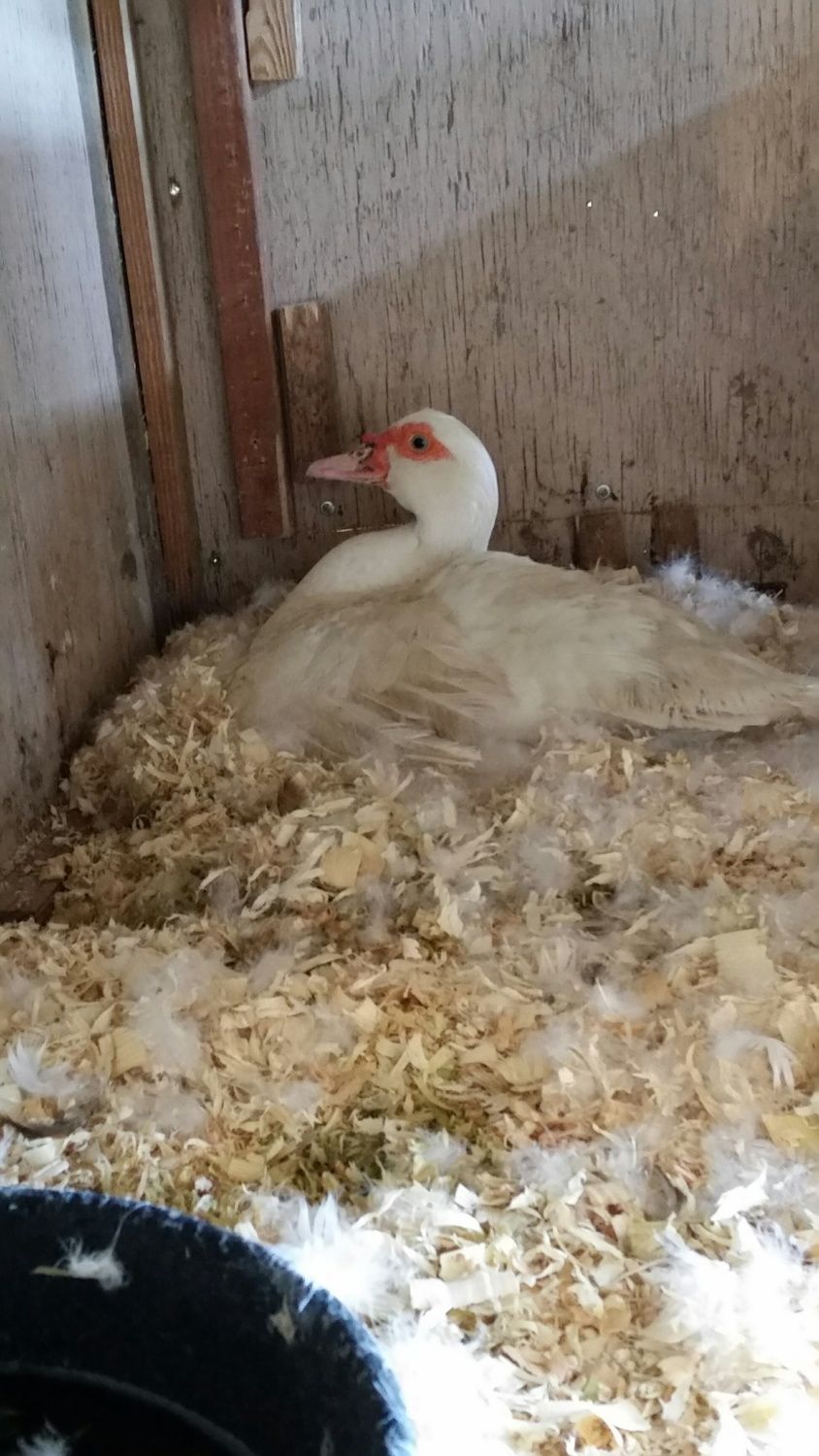 This is Blanche. She'd only been with us for 2 weeks and she went broody. She's a serious sitter. She built her nest in a spot that I knew I should have blocked off because I myself could not reach it and I wanted to be able to count her eggs, and help her, lol. My DH and brother in law helped me move her successfully to a better location. During the move I pulled 6 eggs to incubate in case she abandoned. She went bolistic at first but then settled down. I locked her in so she really didn't have a chance to abandon