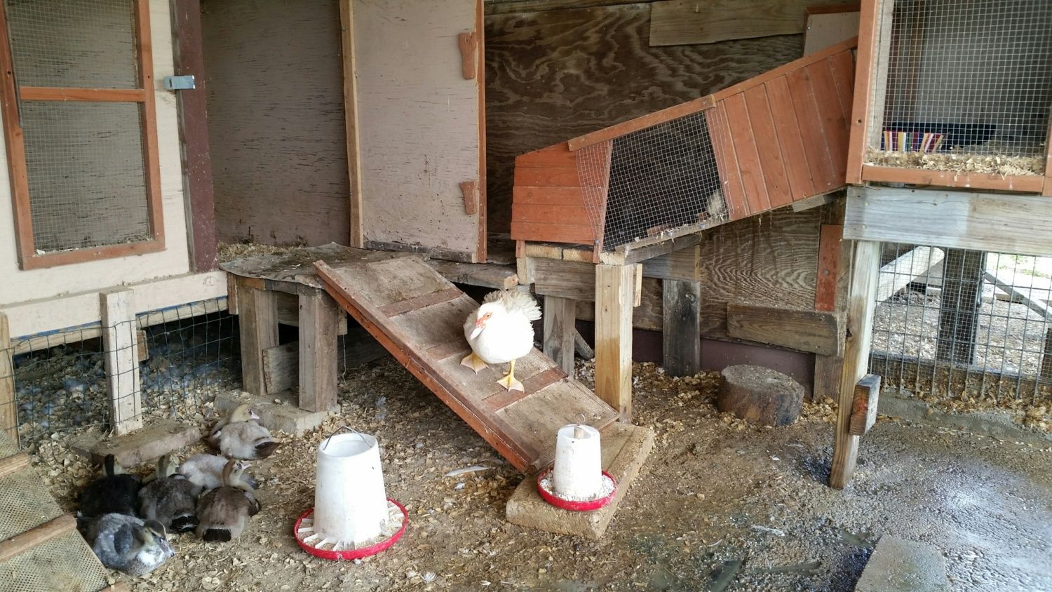 This is Blanche. She'd only been with us for 2 weeks and she went broody. She's a serious sitter. She built her nest in a spot that I knew I should have blocked off because I myself could not reach it and I wanted to be able to count her eggs, and help her, lol. My DH and brother in law helped me move her successfully to a better location. During the move I pulled 6 eggs to incubate in case she abandoned. She went bolistic at first but then settled down. I locked her in so she really didn't have a chance to abandon:/ By candling, all 6 eggs were fertile, active and appeared to be on day 8. I have since moved the eggs back under her. She came out today for a stroll, bath and to POO