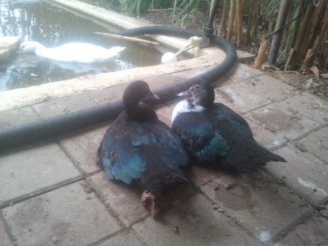 So those are my ducks! I also have some questions which I am hoping someone might know the answer to... Since the arrival of the mallard ducks, the male is hogging the pool and chases out anyone who ventures inside, even the muscovy males who are twice his size! The female immediately started laying eggs and is now sitting on a collection of 12 eggs. The nest is close to the pool edge. Could this be the reason he chases off all other ducks? I am hoping he will let the others back into the pool once the ducklings have hatched. He is very protective of her. It seems a strange time of year for a duck to start building a nest. I live in Israel though and the winters here are much milder than in Europe (where I am originally from and the mallard ducks too, I suppose). The rainy season has just started, but it doesn't get extremely cold. It never snows or freezes where I am. I suppose the ducklings will be OK even if they hatch in December and it isn't actually spring? We suspect there might be a couple of chicken eggs in the nest, too - we've seen one of the chickens sitting in there with her. If this is true and those eggs hatch, they will hatch about a week before the ducklings, am I right? I wonder what the mother duck will think of this? Will she push the chicks out or harm them? Is there a chance she will accept them as her own? I suppose we should keep a sharp eye out. Lately, the female muscovies have started flying around a little. The males stay on the ground, but the females like to roost in trees or on the roofs of the coops. I used to put them in with the chickens at night, but now it's impossible and they stay out. The guinea fowl do the exact same thing. Until now, predators have never managed to get inside the enclosure, but it has happened once or twice that a chicken flew out and was caught by a fox or something else (a load of feathers outside by the fence and the chicken gone). Unfortunately now, both lovely black female muscovies have disappeared. When the first one went, I assumed she had flown out and was taken by a predator. I didn't see any trace of a fight, but who knows. About a week later though, the second one also went - same thing, just gone without a trace of feathers or blood or anything. I don't know how old they are exactly as they were dropped off by someone in the night, but I estimate around 5 months old. Would it be possible that they have both started laying eggs like the mallard duck, somewhere outside the enclosure and have now started sitting on them?? What would be a likely place for a muscovy to nest? Until now, I have only looked on the ground, but maybe they like to nest up higher, in a tree or something? I am a bit at a loss. The last time I saw her was last night, when she was peacefully sleeping on the roof. What could have got to her up there..? Should I be afraid for my last remaining female (Katya) and clip her wings? Also, I wonder if these ducks migrate? Could they have seen a flock of migrating ducks flying overhead and tried to join them? Even more worrying, will the mallard ducks try this as soon as their ducklings have grown?? OK sorry for this load of questions