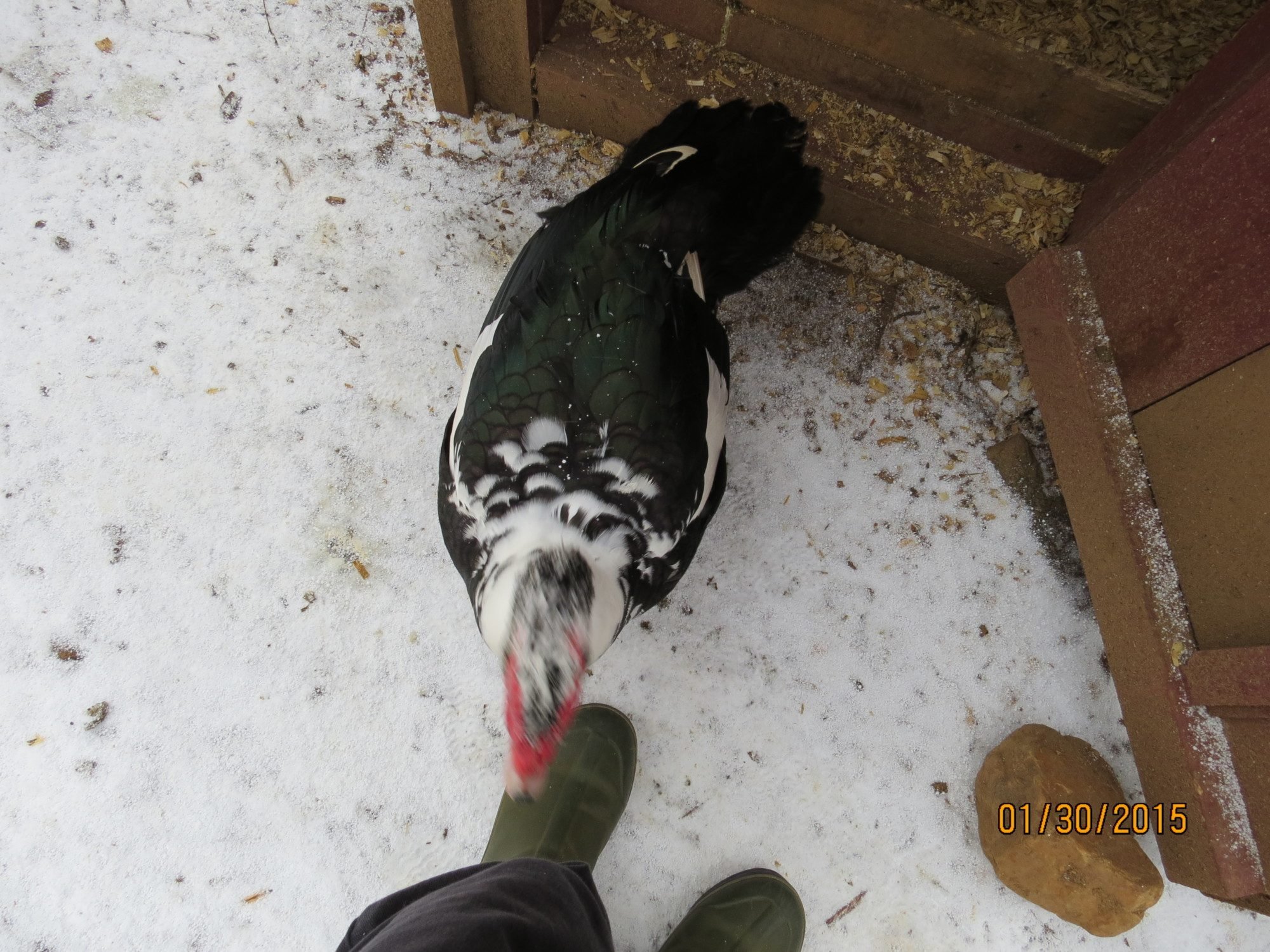 Poult: Yes, I'm sure he's a male. He has the red caruncles on his face and he's twice the size of the females. Which makes it interesting that he appears to be afraid of them now. I've had the six together for most a year with no problems. He started having the ruffled feathers about 2 or 3 weeks ago. This is the first time he's resisted going in the greenhouse with the girls, though none of them have not been found of being in the greenhouse for long periods. It's pretty small (8 by 8) so I try to only keep them in over night and if it's warm enough, they go in their covered pen instead. I'll try to get a picture tomorrow of the messed up neck. It does look like what the pekin males I had did to the females, but this is definately a male and the girls are the ones going after him.