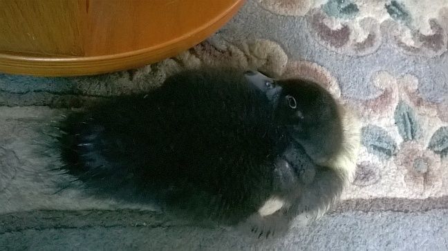 this is Kiss Me Daffy at three weeks. chocolate tipped body fluff. Looks like a dusky gene maybe.