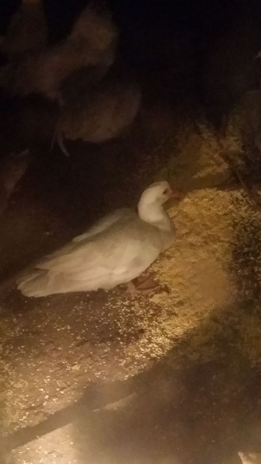 I'm worried a cat got him...but I haven't found a corpse or anything. With this horrid weather I'm already concerned about cocci and I've had one young chicken I had to bring inside. Sorry got off track. Just feel terrible about it. Like I saw him when I moved the tractor but then I can't find him. Ugh. But here is quack quack. Gosh I hope you have found your missing duck by now,I did end up giving my young muscovy "quack quack" (3 year old named him) a bath last night. He was very happy. I don't have a clear pic but a dark one I do haha.