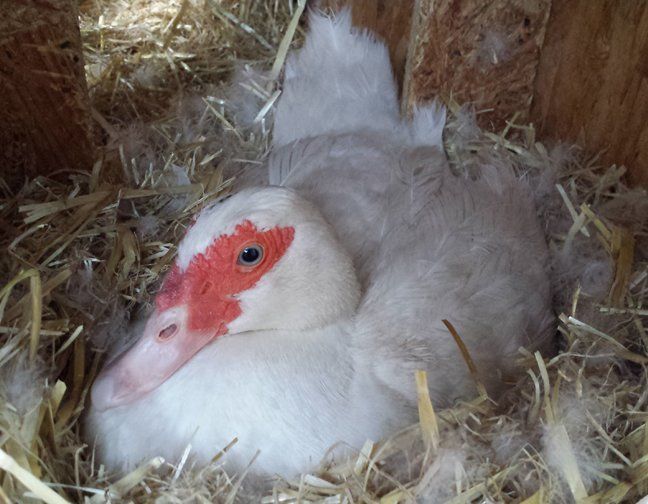 Super broody Muscovy duck Zoe! She is sitting on 25 eggs! Also have a link to a video of her on the nest: http://goo.gl/fvSrE3
