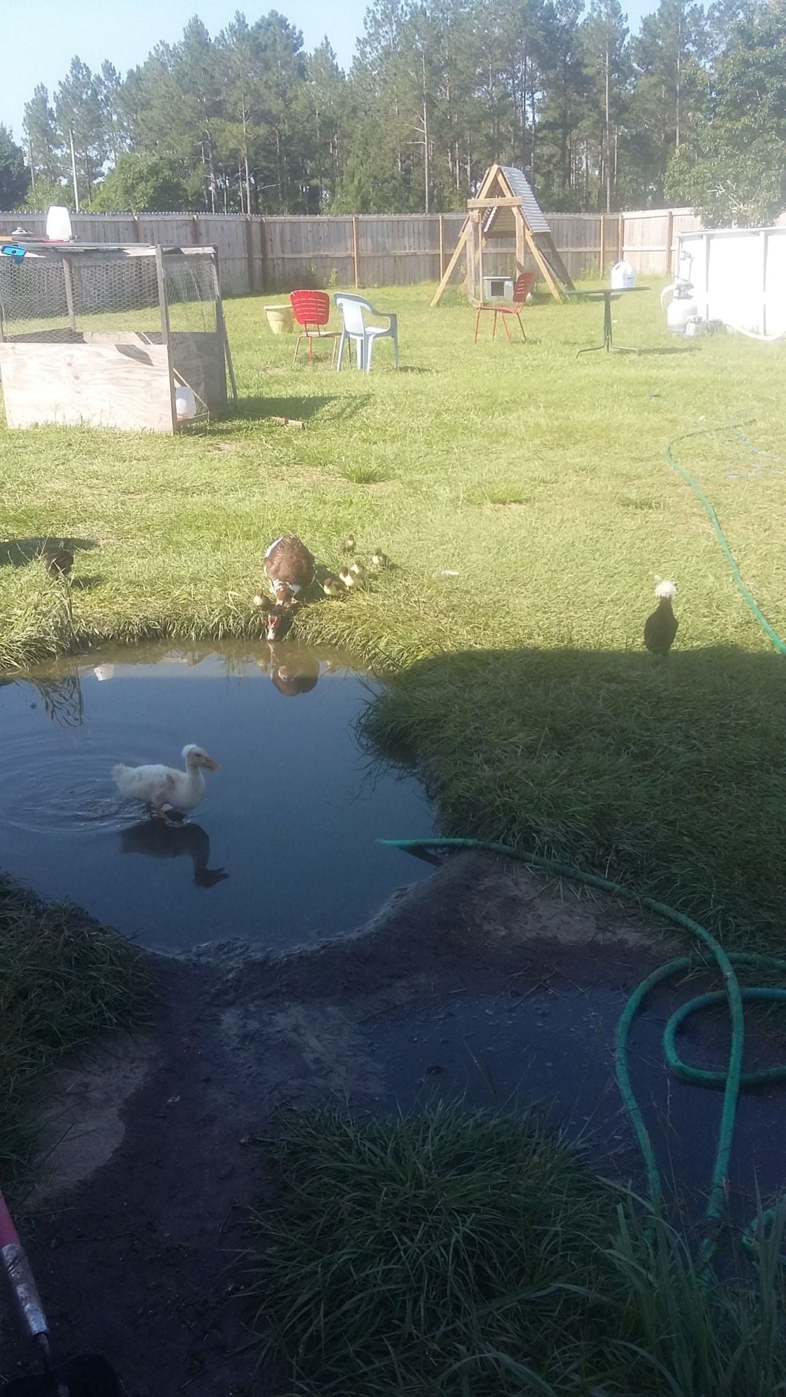 Well the little stinker. They sure aren't like chickens they will pretty much let their little ones do what they want, where a chicken keeps close tabs on her babies.She's evil. Lol. 6 of her babies were across the yard in the duck puddle without her and she was still sitting on 2 babies and the three remaining eggs. When I brought the babies back to her she flew off the nest attacking me. Last time I didn't touch her to move her. I just moved the babies and she followed. Hopefully we have muscovy proofed this pen. The last pen we put her in, she and the babies were escaped in minutes.