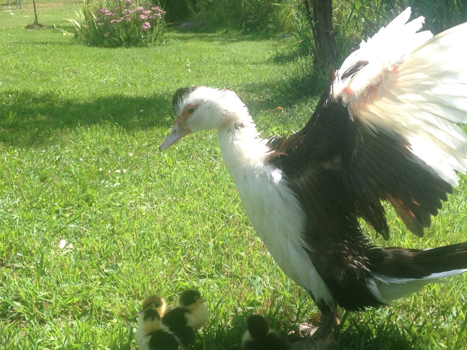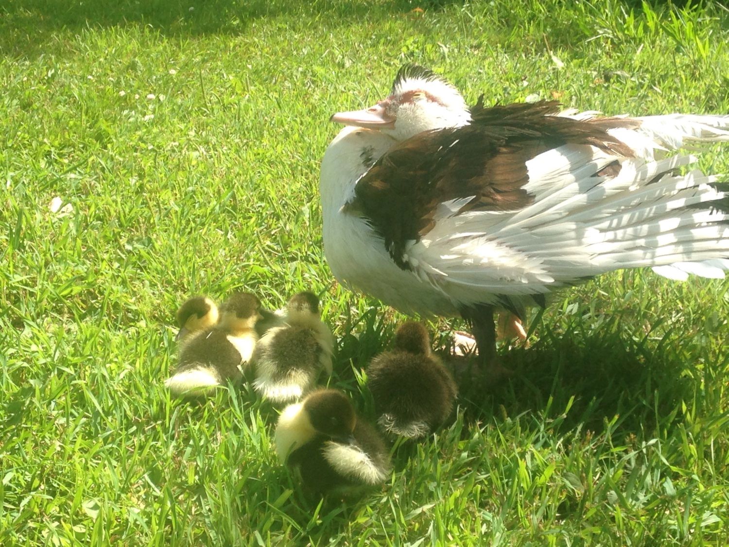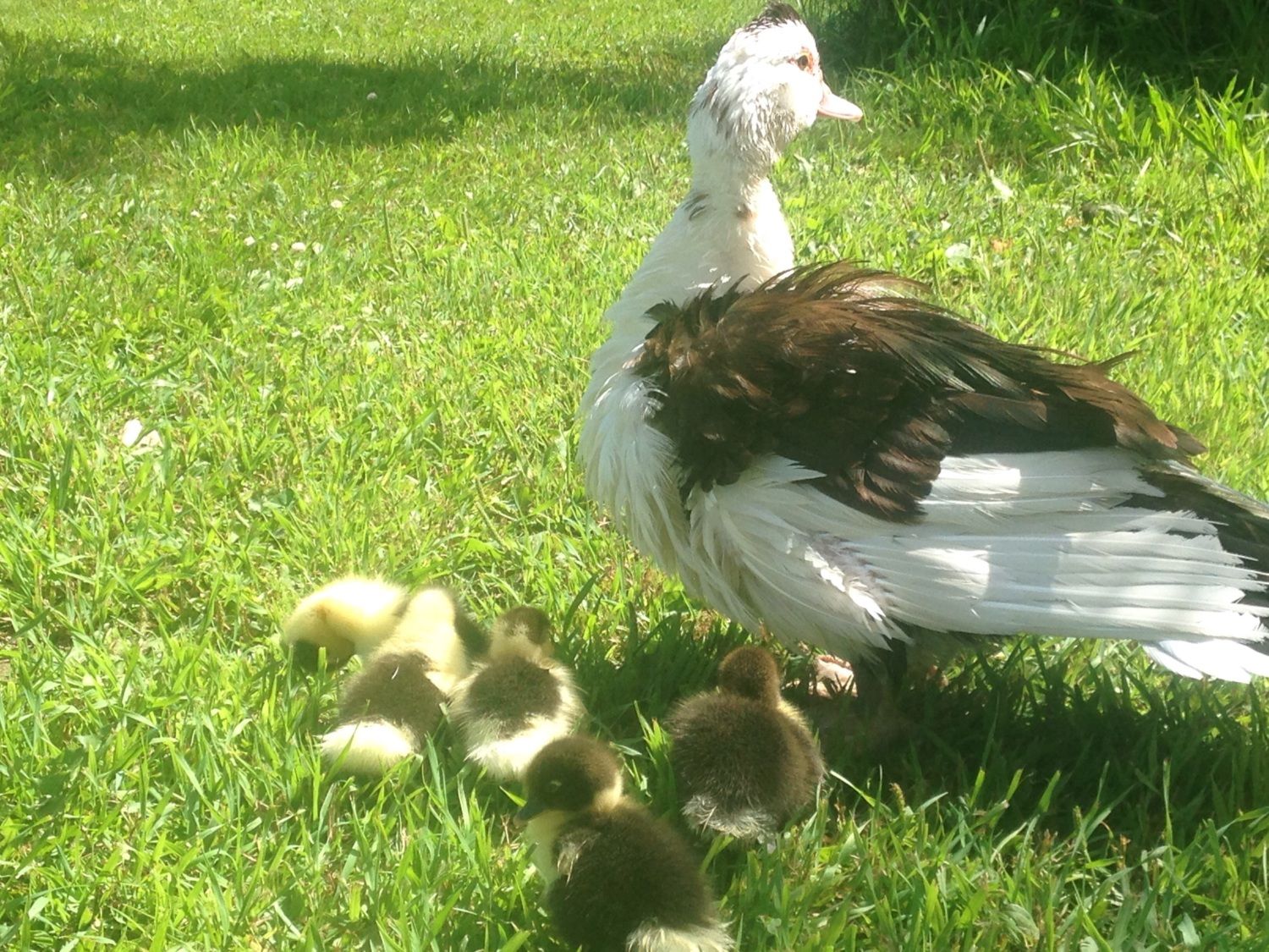 My one year old girl Magpie and her one day old ducklings just after a swim in our pond.