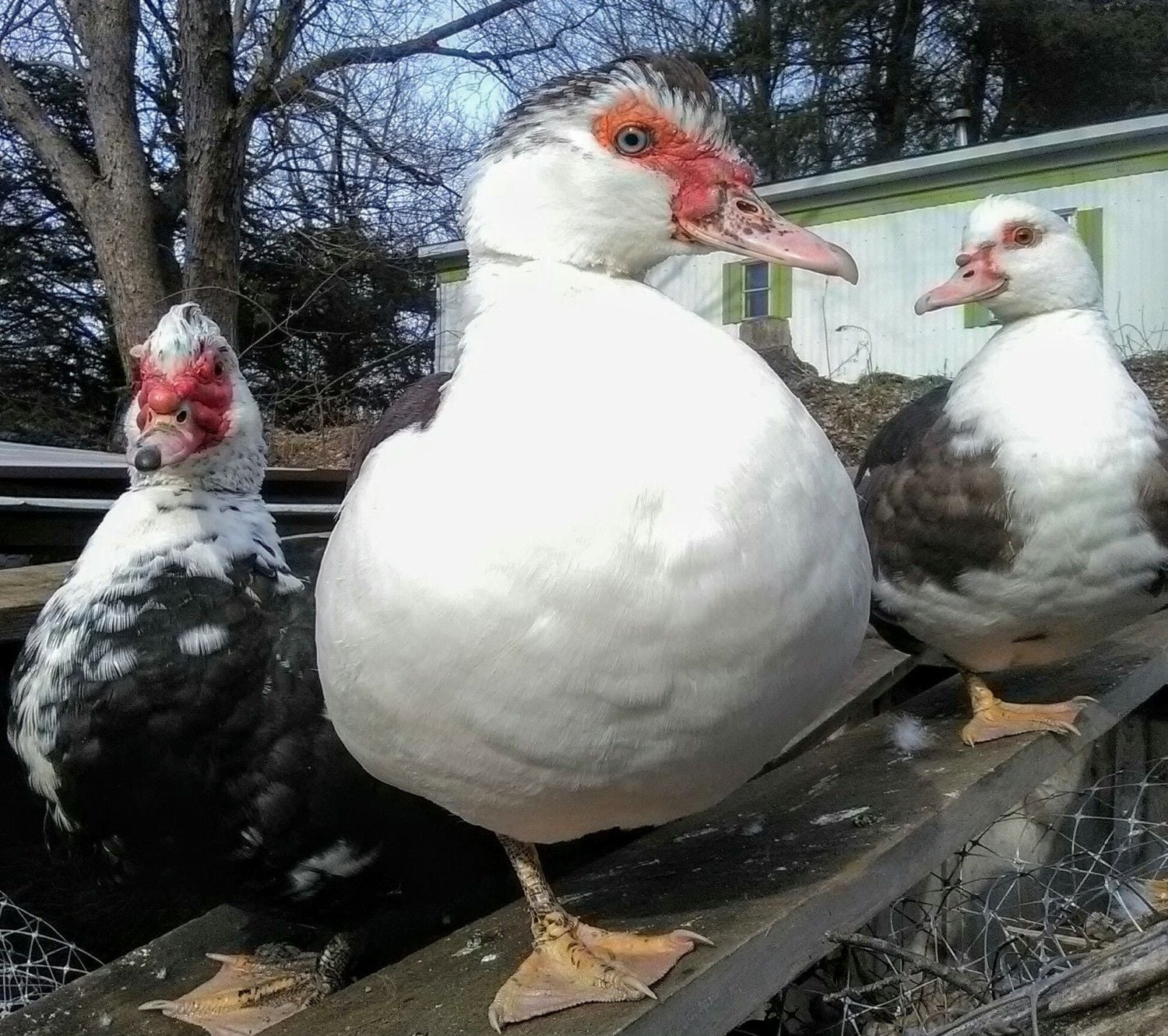 Finding this thread has made my morning complete! We ended up getting one Muscovy by accident. It was actually the only breed I didn't want. And half hour after getting her I started looking for more! Love them so much! This is my big guy Neptune and his girls Jupiter and Andromeda. We got them as adults so they tolerate me but we have 10 babies coming in May that I can't wait for. Five chocolate and five blue. Hopefully going to have some of every color eventually.