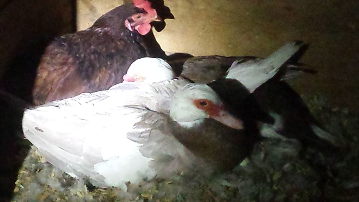 Chicken Jane found a comfy corner in the duck house next to two nesting Muscovies.